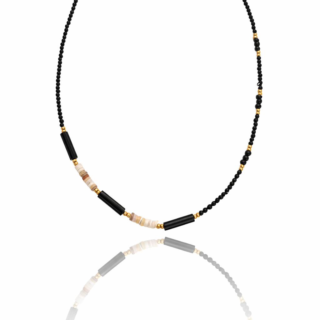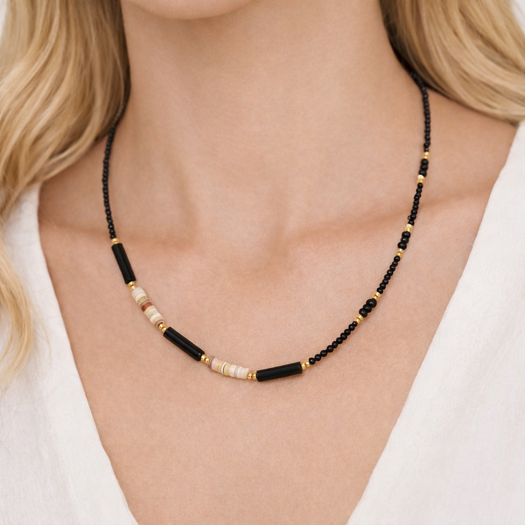 Naszyjnik klasyczny z czarnymi faestowanymi kryształkami oraz kamieniami z masy perłowej. Prezentuje się bardzo stylowo. Jakość i unikalny design w jednym. Idealny do noszenia na co dzień lub na prezent.