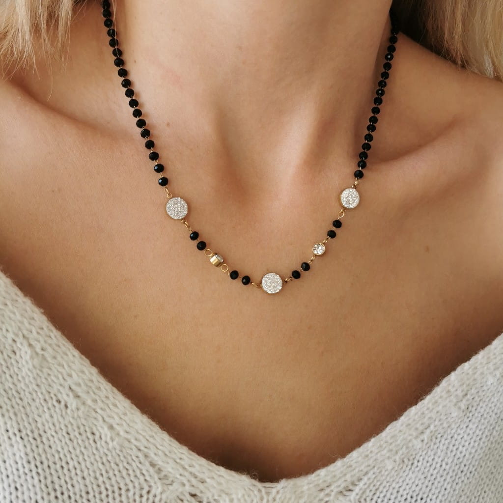 Wyróżnij się stylem z dodatkami SOHO Biżuteria! Naszyjnik/celebrytka z najnowszej kolekcji, wykonany z wysokiej jakości stali chirurgicznej 316l, w kolorze złota. Naszyjnik ze stali szlachetnej z czarnymi koralikami i jasnymi kryształkami. Klasyczny model, idealny na co dzień i na wyjścia. Sprawdzi się również na prezent.