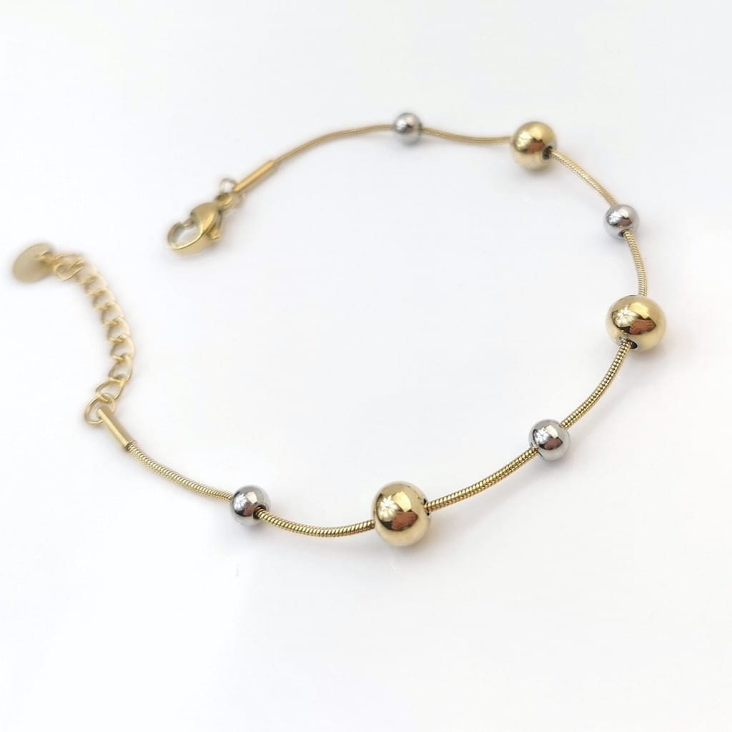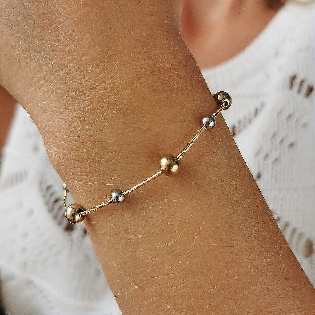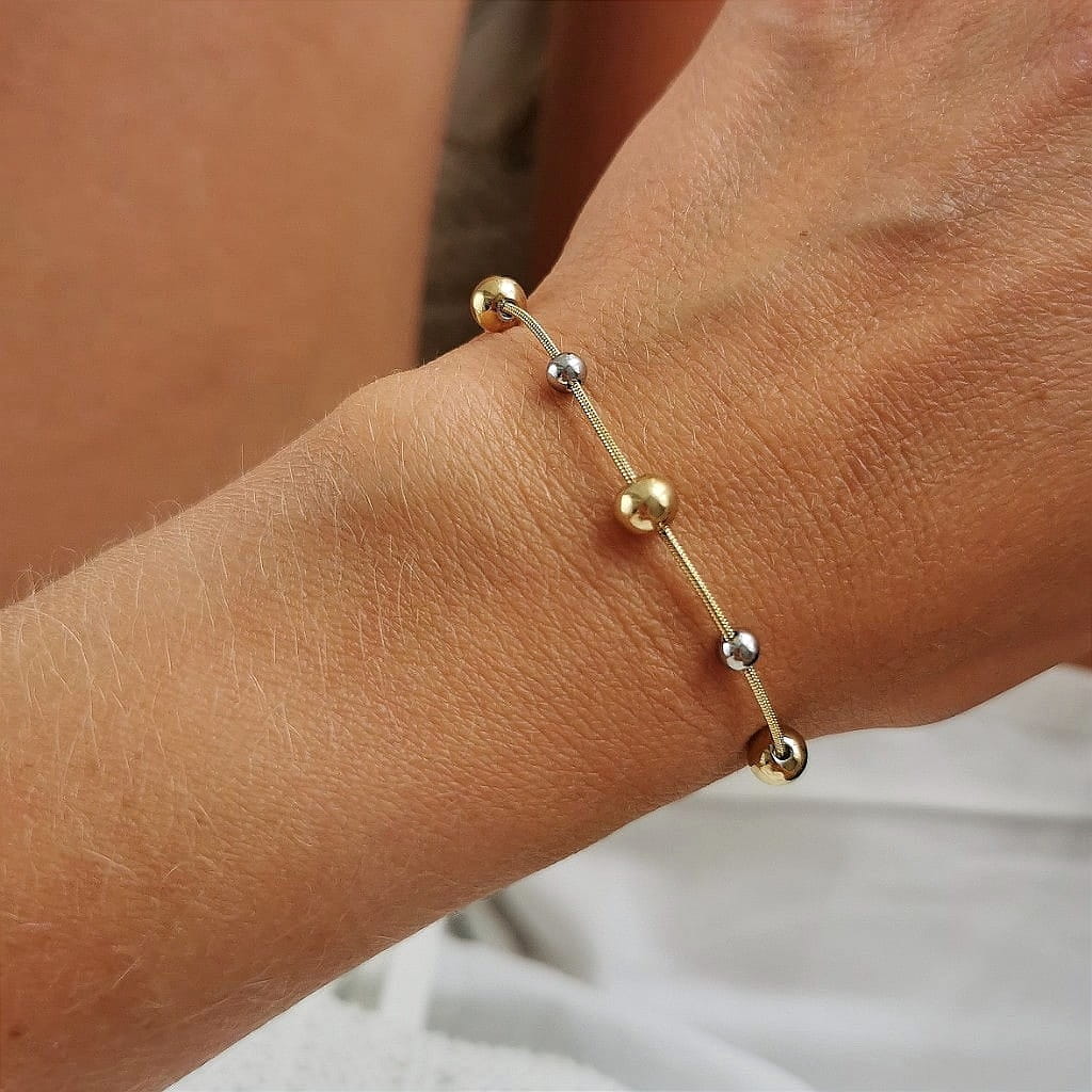 urocza bransoletka z najnowszej kolekcji SOHO Biżuteria, wykonana z wysokiej jakości stali chirurgicznej 316l,w kolorze złota. Bransoletka ze złotymi i srebrnymi kuleczkami. Klasyczny model, idealny do każdej stylizacji. Sprawdzi się również jako prezent. Do zestawu naszyjnik oraz kolczyki.