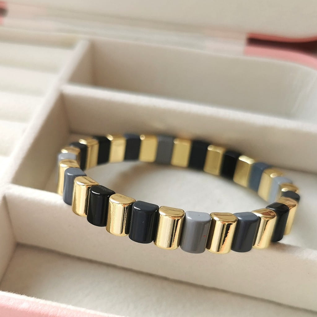 Bransoletka POZŁACANA ze STALI SZLACHETNEJ z czarnymi szarymi złotymi elementami