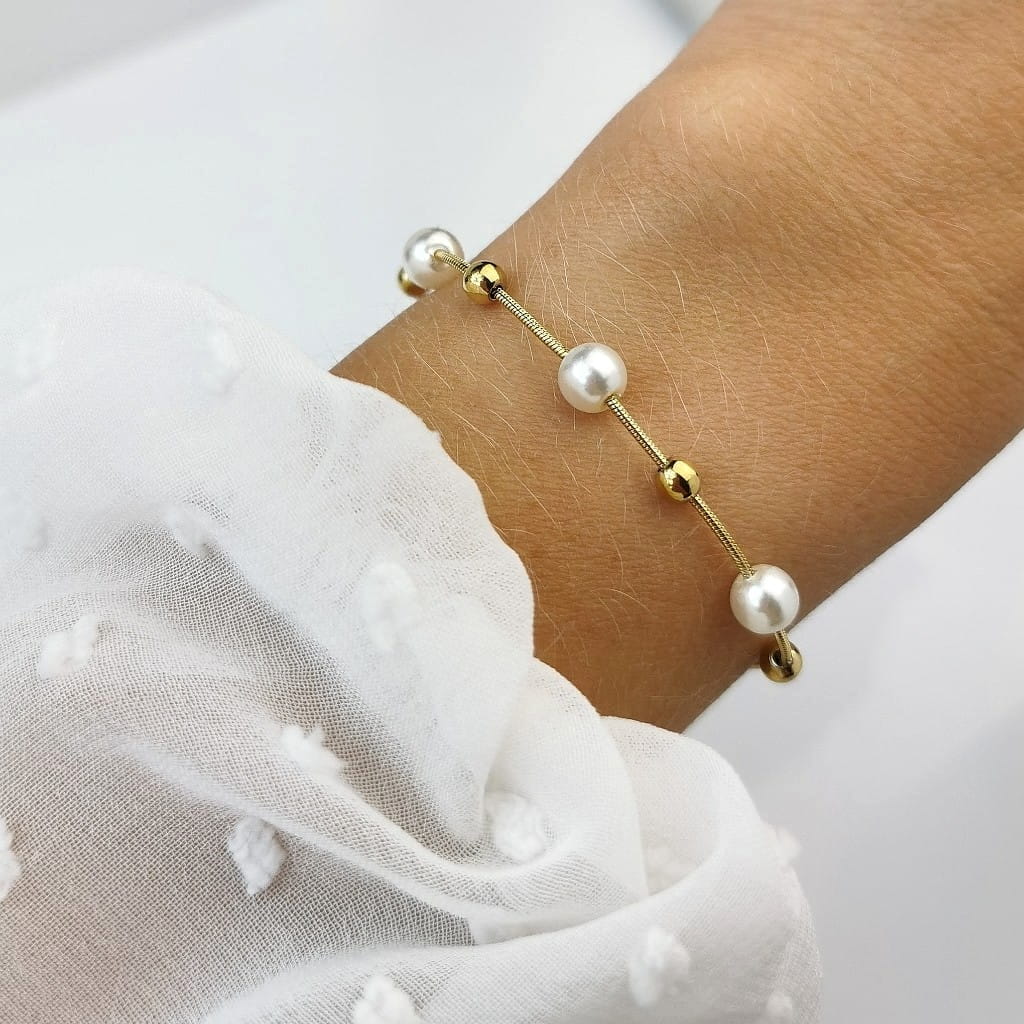 Unikatowa bransoletka z najnowszej kolekcji SOHO Biżuteria, wykonana z wysokiej jakości stali chirurgicznej 316l. Bransoletka o wężykowym splocie łańcuszka, ozdobiona perłami oraz złotymi kuleczkami. Prezentuje się naprawdę rewelacyjnie. Idealna na prezent dla bliskiej osoby.