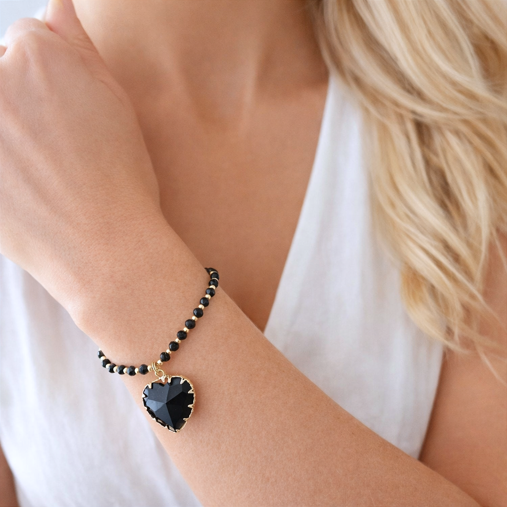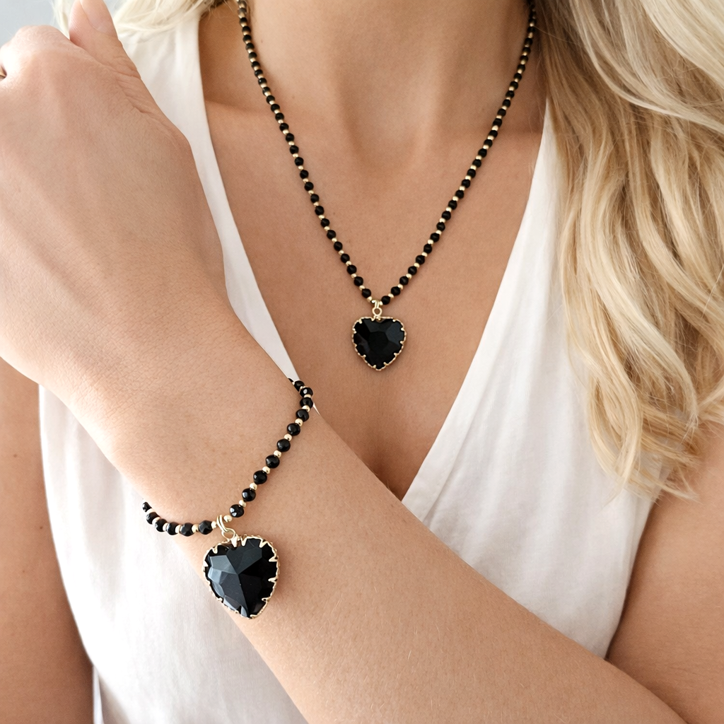 Unikatowy model, który ożywi Twoje stylizacje! Bransoletka z kryształowym czarnym sercem i złotych dodatkach. Klasyczne połączenie, które dopełni zarówno dzienne, jak i wieczorowe stylizacje. Stwórz zestaw z naszyjnikiem.