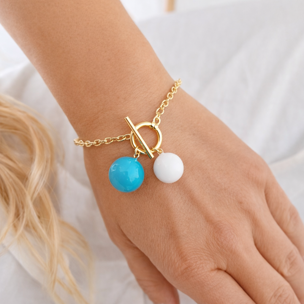 Unikatowy model, który ożywi Twoje stylizacje! Bransoletka z emaliowanymi kulami to must have tego sezony! Baw się modą i kolorami! Bransoletka sprawdzi się do jeansów, białej koszuli czy marynarki. Na codzień i od święta! Musisz ją mieć! Do zestawu dobierz naszyjnik, kolczyki lub pierścionek. Cena dotyczy 1 sztuki bransoletki.