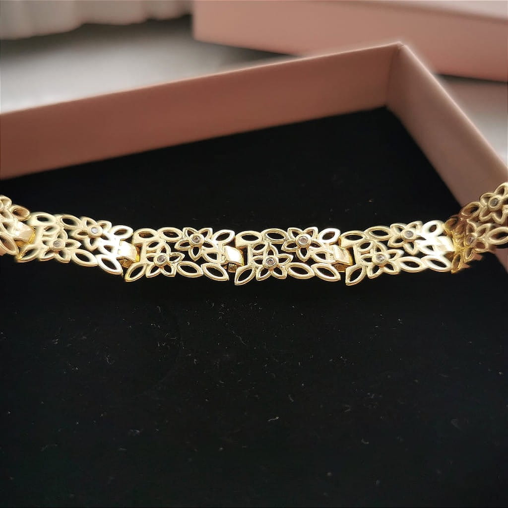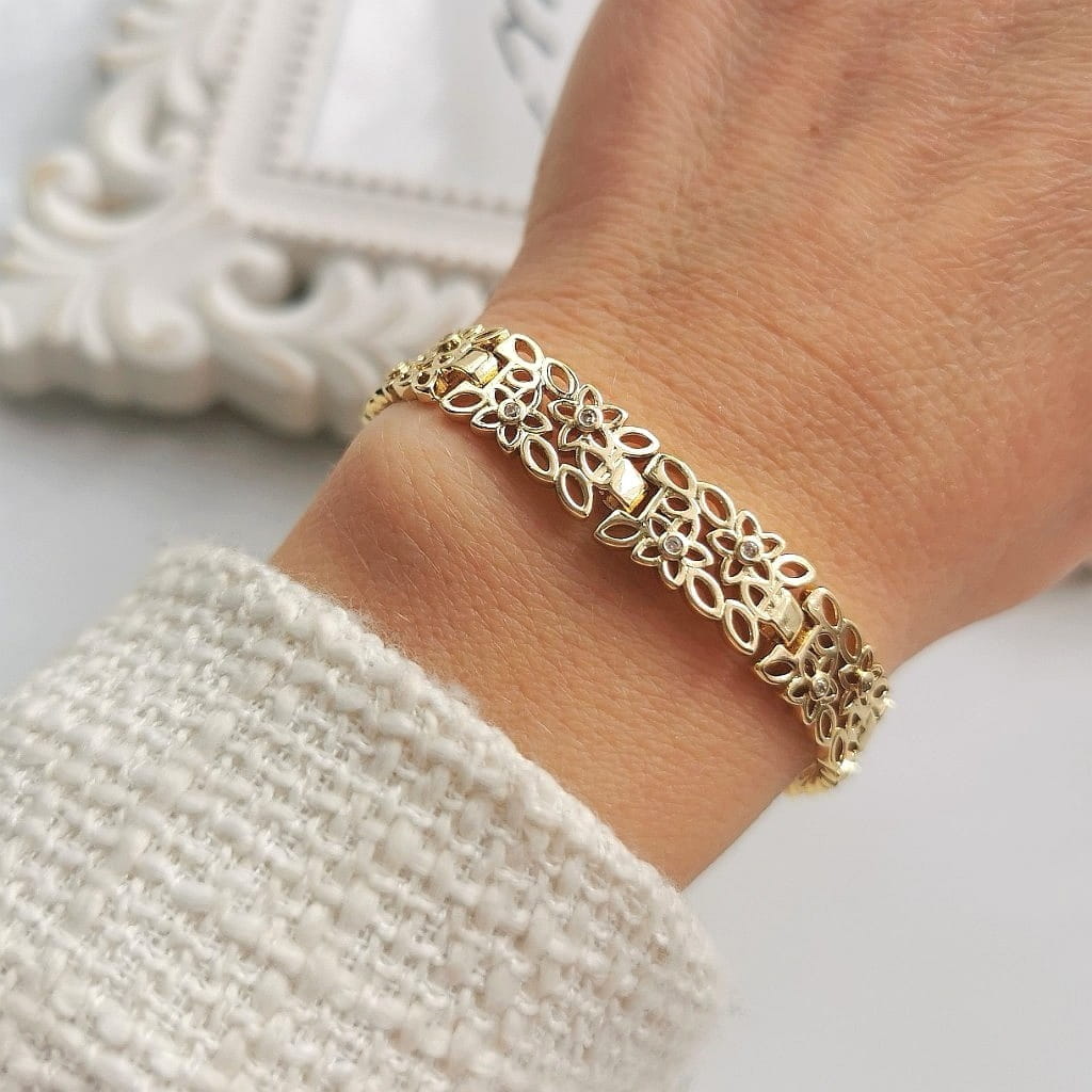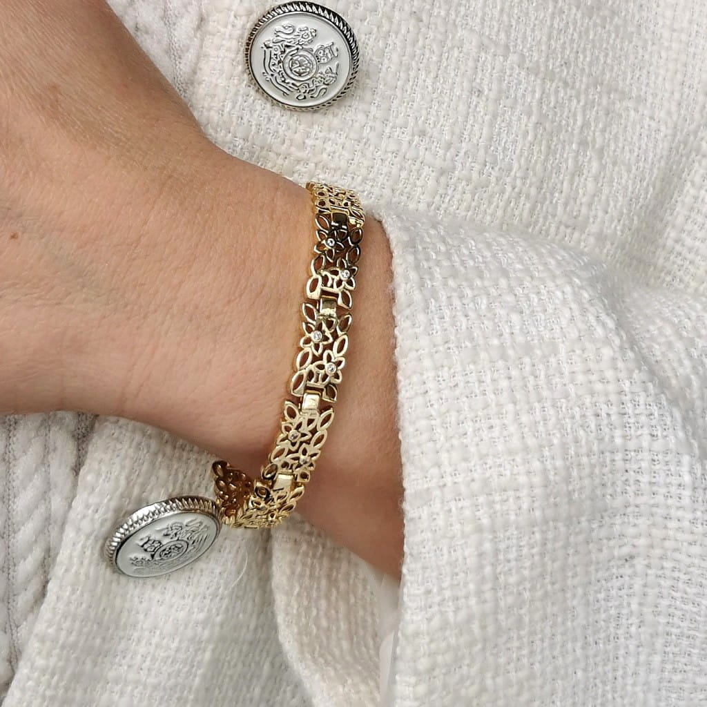 Unikatowy model bransoletki ze stali szlachetnej z motywem kwiatuszków, z jasnymi cyrkoniami. Przepiękny model, który świetnie wpisze się do każdej stylizacji. Naturalny kolor złota 14k sprawia, że bransoletka prezentuje się jak od jubilera! Must Have! Do kompletu dobierz kolczyki o tym samym wzorze.