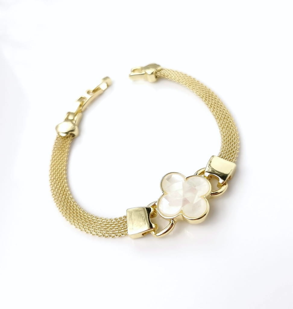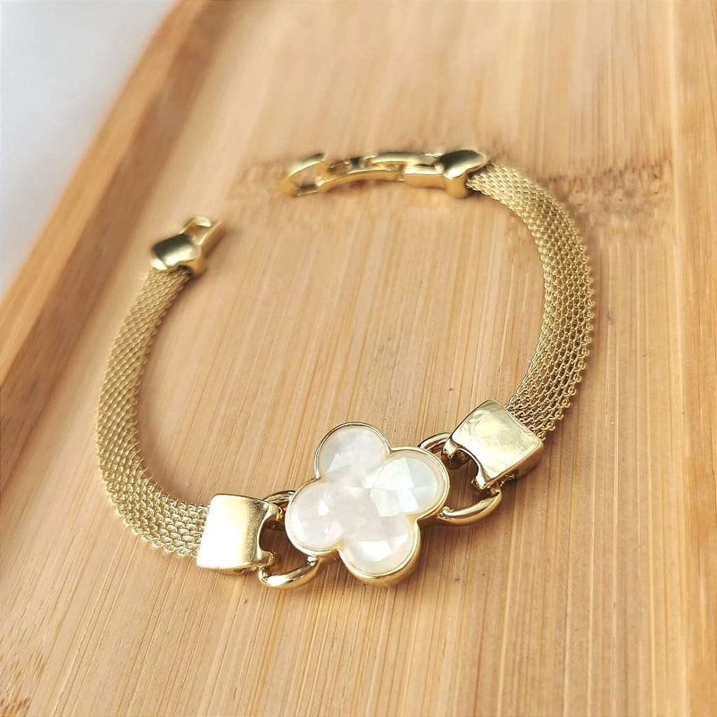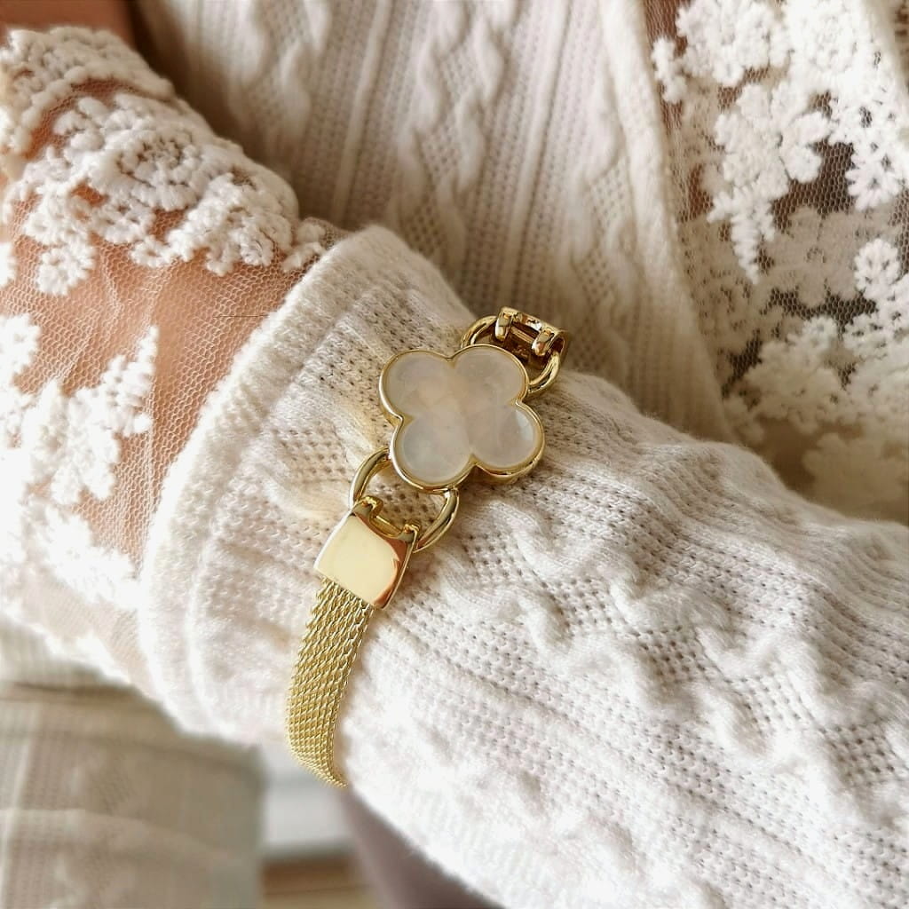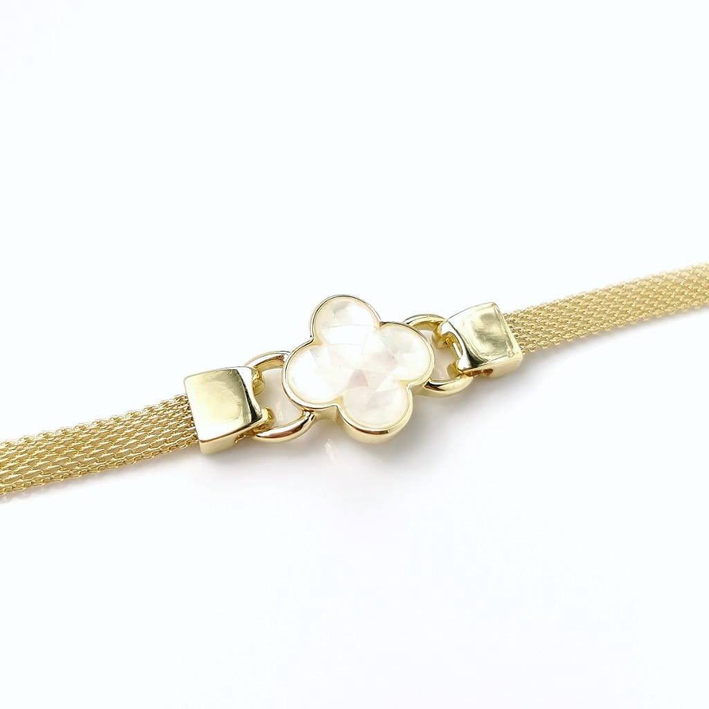 Perłowy blask i elegancja! Bransoletka z Lumi Collection. Luksusowy wzór, który doda twoim stylizacjom elegancji i kobiecego szyku. Subtelna złota siateczka w połączeniu z ozdobną zawieszką z masy perłowej to kwintesencja elegancji i klasy!