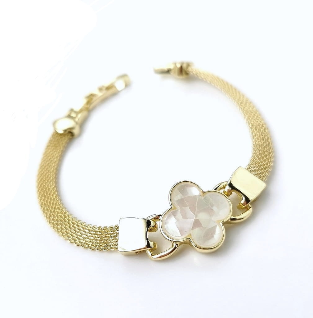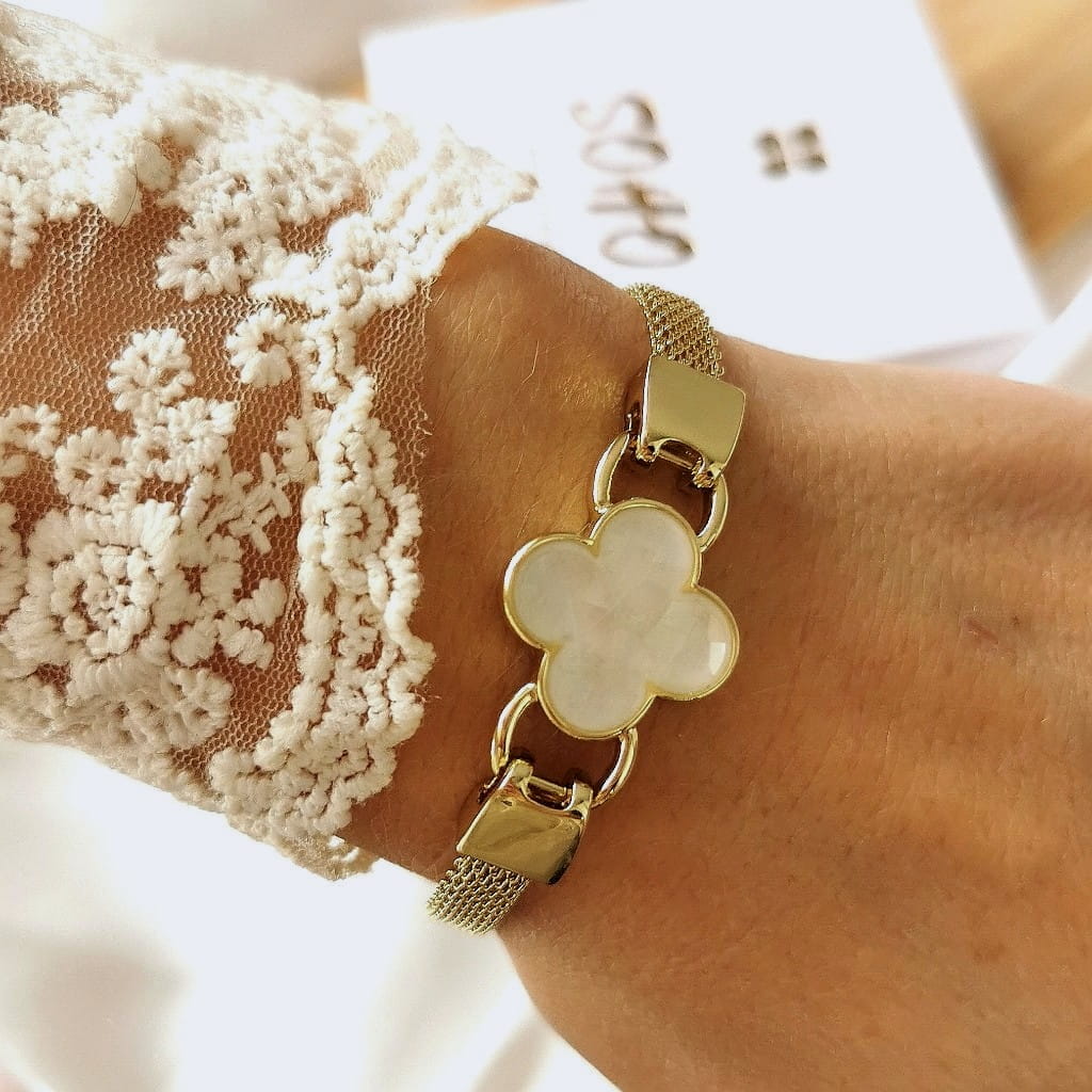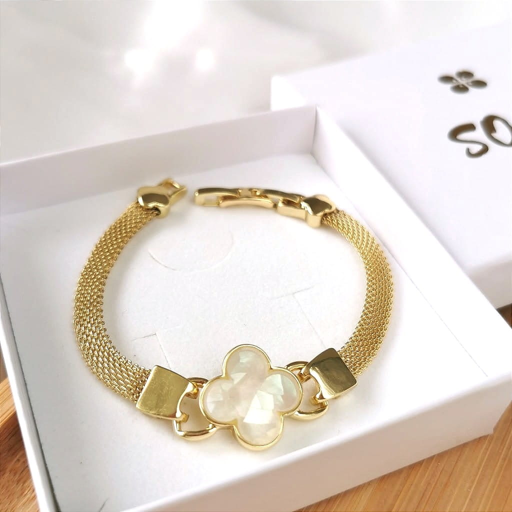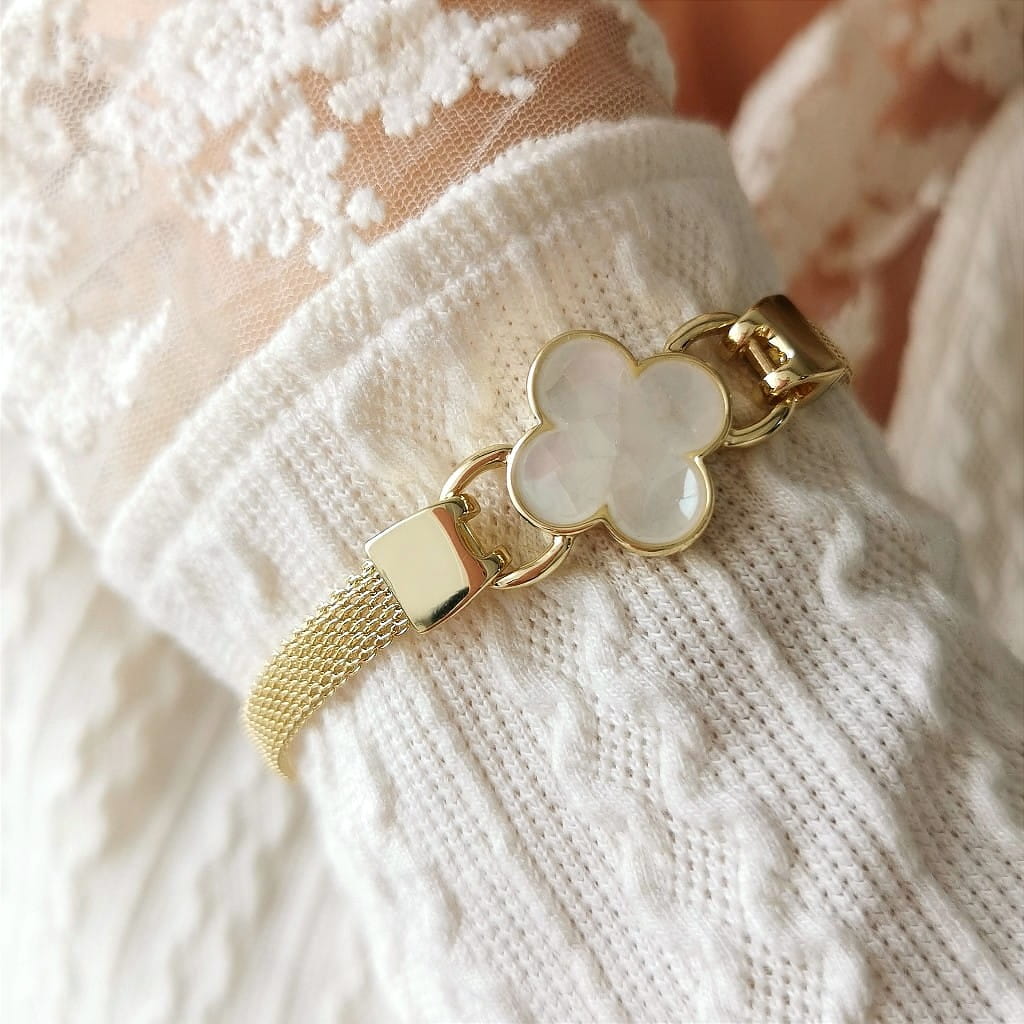 Perłowy blask i elegancja! Bransoletka z Lumi Collection. Luksusowy wzór, który doda twoim stylizacjom elegancji i kobiecego szyku. Subtelna złota siateczka w połączeniu z ozdobną zawieszką z masy perłowej to kwintesencja elegancji i klasy!