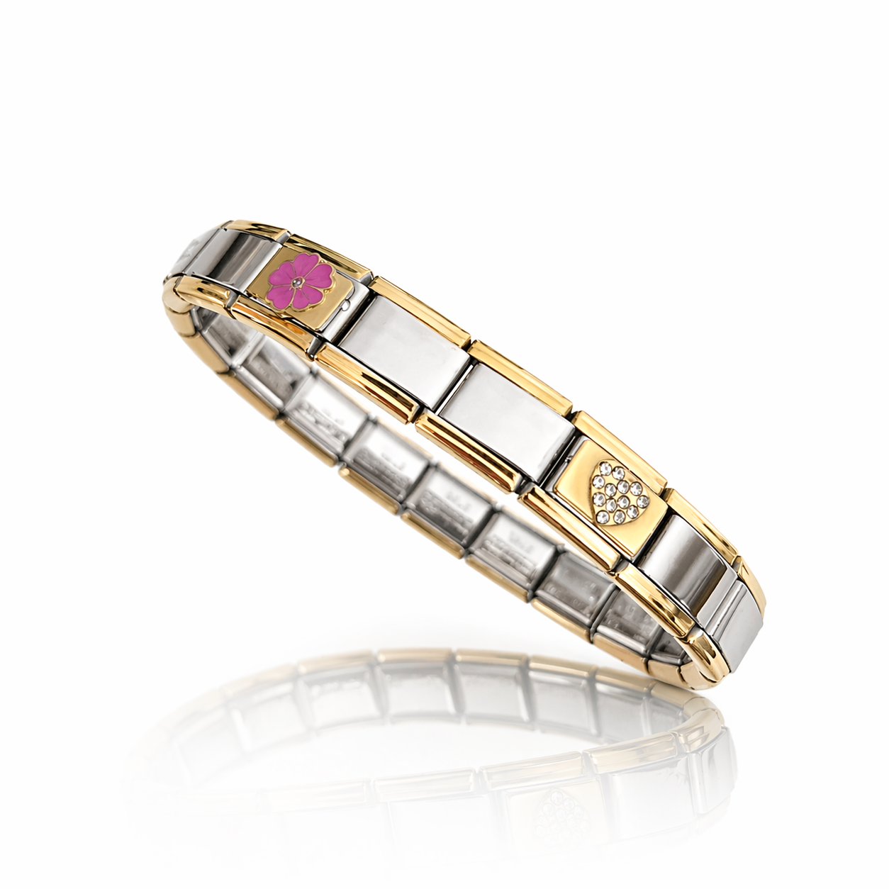Elegancka bransoletka modułowa w odcieniu złota i srebra, ze ozdobami. Idealne połączenie klasyki z nowoczesnym wyglądem. Subtelne zdobienia i geometryczna forma nadają jej unikatowego charakteru, który podkreśli zarówno dzienne, jak i specjalne okazje.