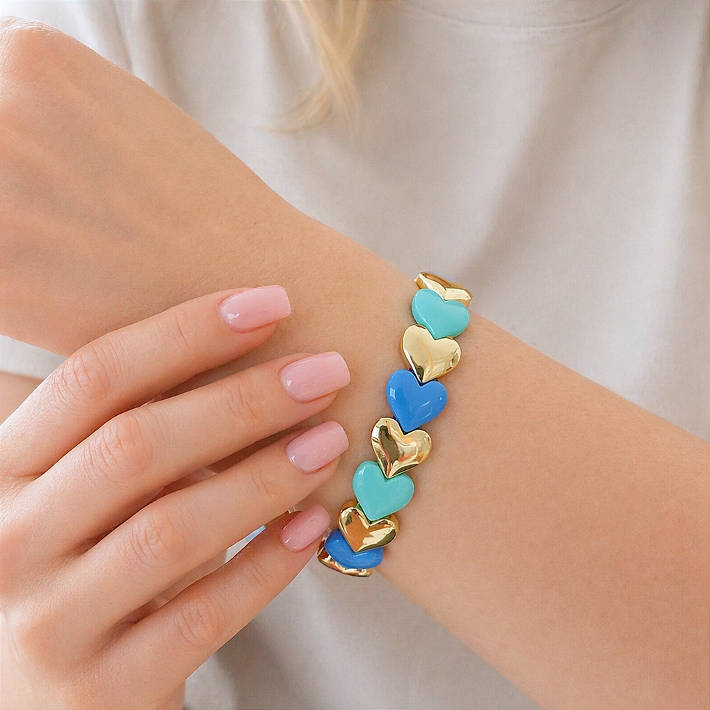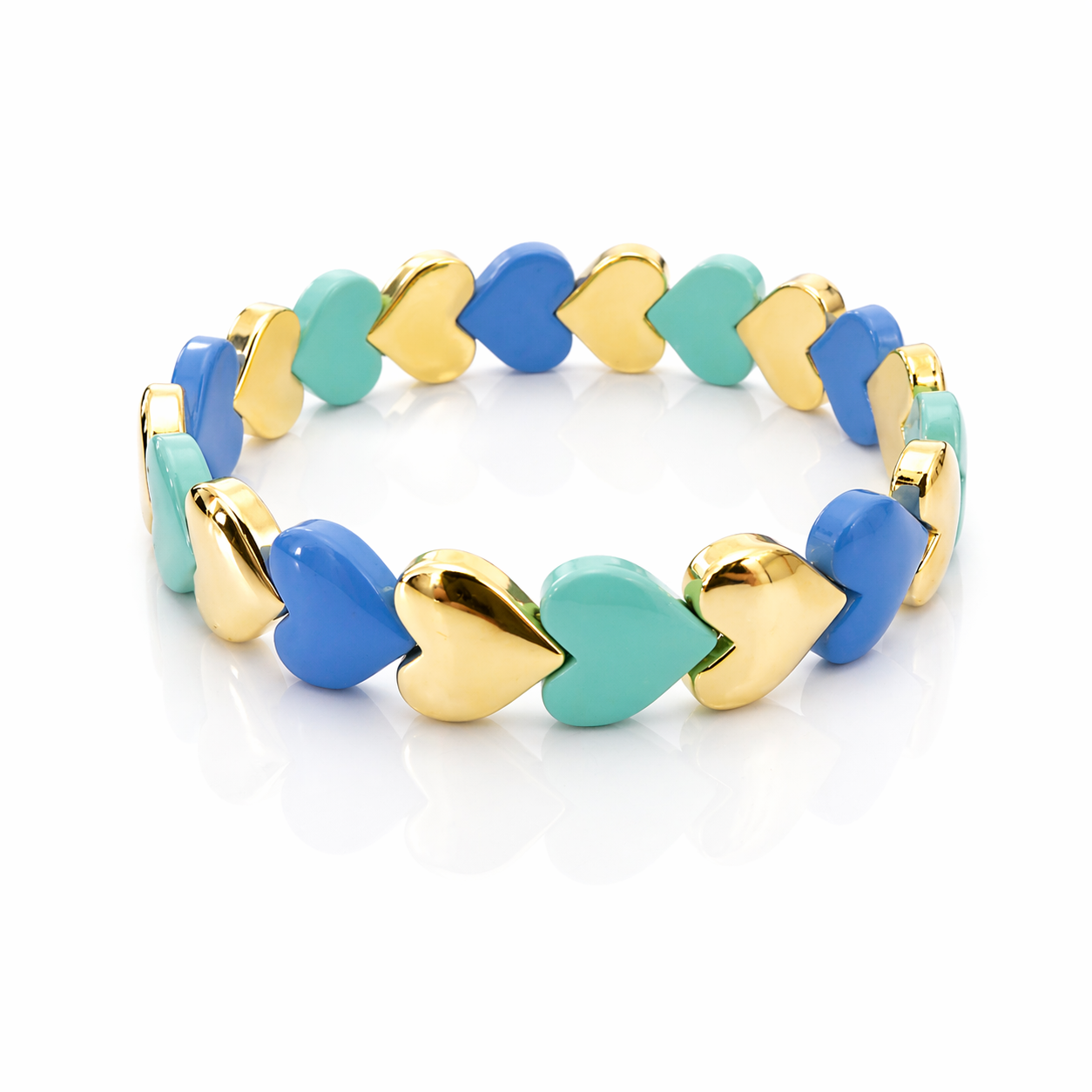 Bransoletka serca turkus, niebieski emalia pozłacana elastyczna