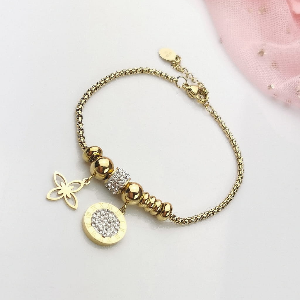 Dodaj swoim stylizacjom blasku z uroczą bransoletką z najnowszej kolekcji SOHO Biżuteria, wykonaną z wysokiej jakości stali chirurgicznej 316l, w kolorze złotym. Bransoletka pozłacana 14k złotem przyciąga uwagę i sprawia, że Twoja stylizacja będzie bardzo kobieca i elegancka. Bransoletka modułowa, o wężykowym splocie łańcuszka w kolorze złota, z cyrkoniowymi zawieszkami typu charms. Prezentuje się obłędnie. Zachwyca jakością i starannością wykonania. Idealna także na prezent dla bliskiej osoby. Spraw sobie odrobinę luksusu i zamów biżuterię, którą pokochały kobiety na całym świecie.