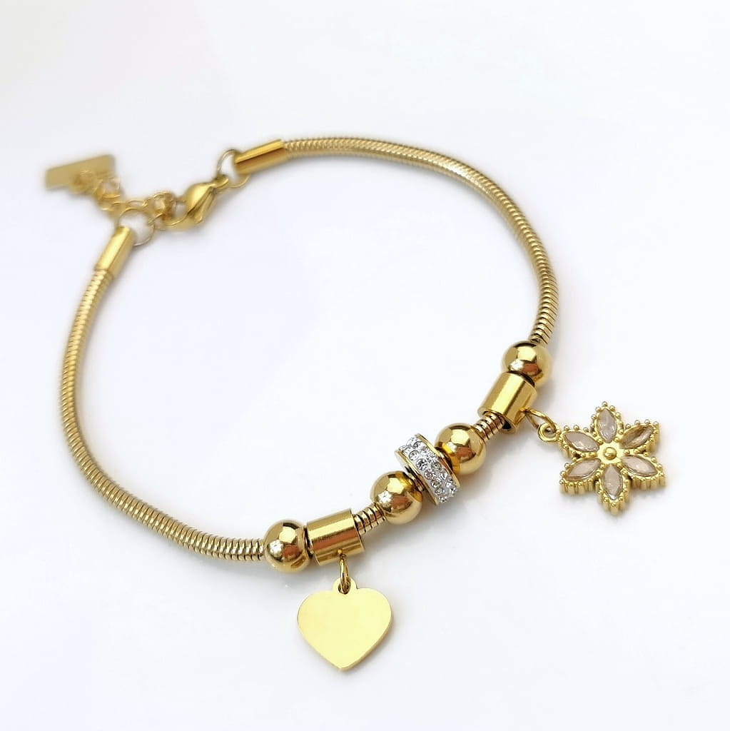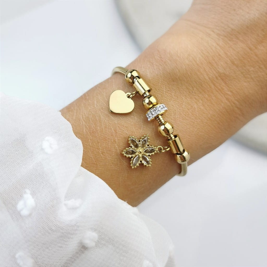 Bransoletka ze STALI CHIRURGICZNEJ modułowa serce kwiatuszek kostki kryształy kolor złoty