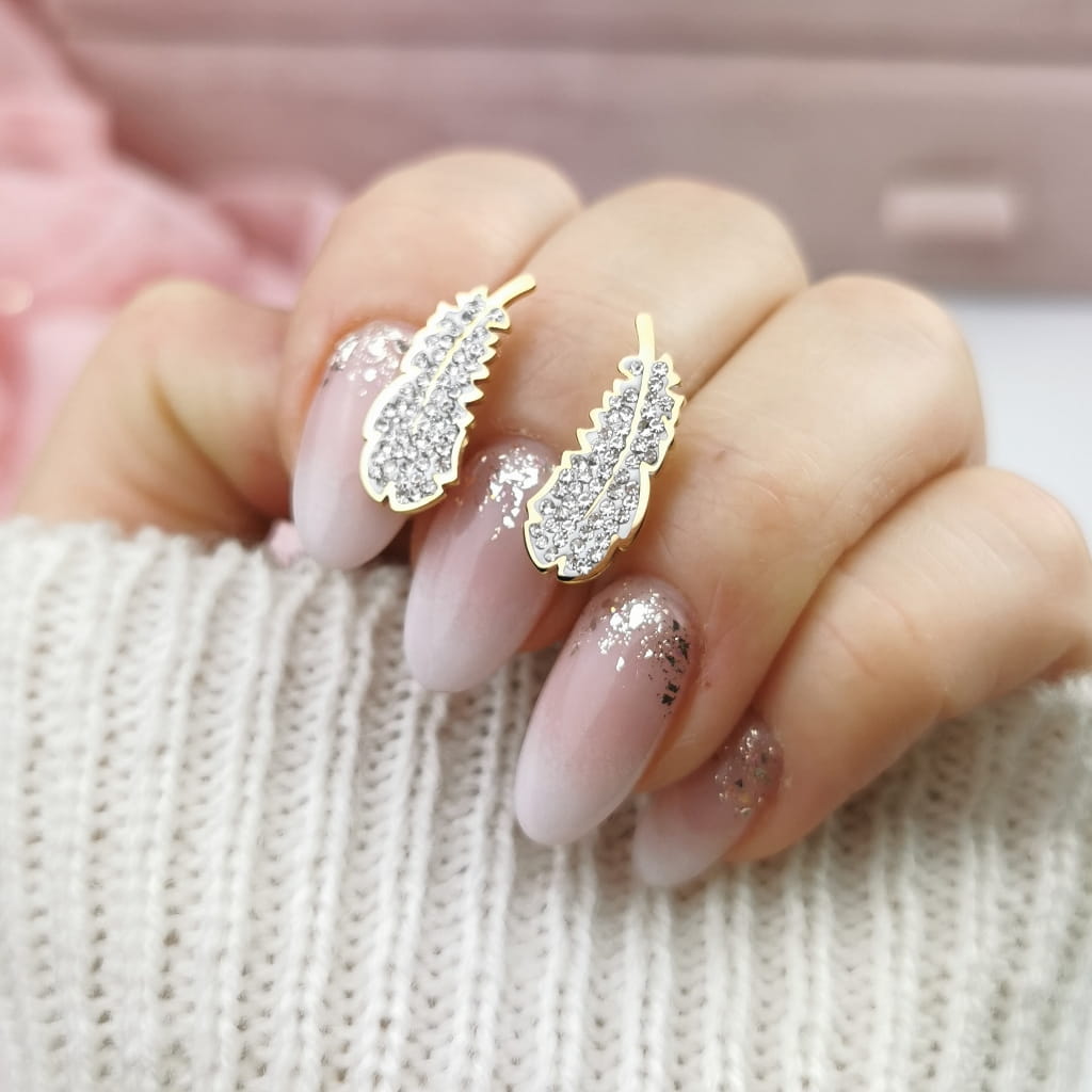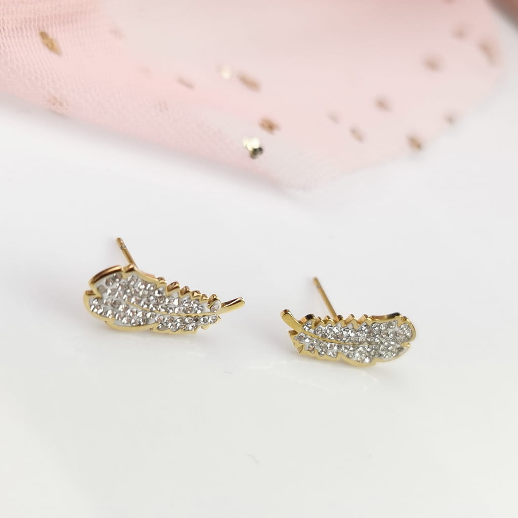Kolczyki STAL CHIRURGICZNA piórka jasne kryształki kolor złoty Blueberry