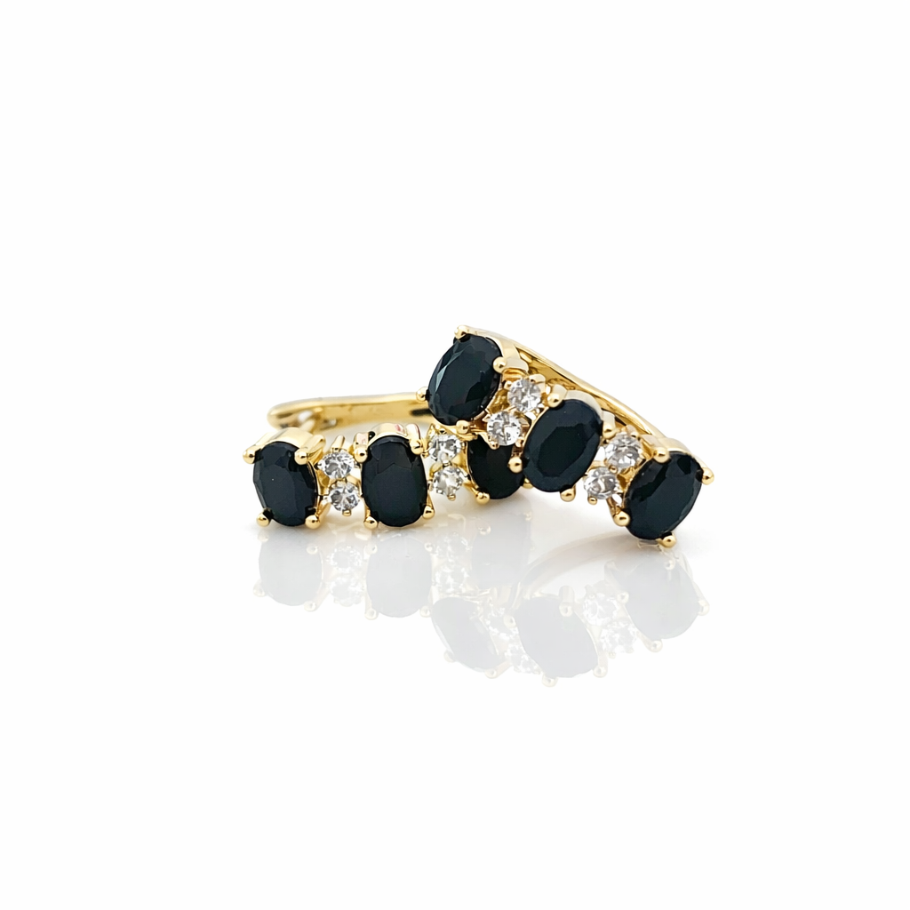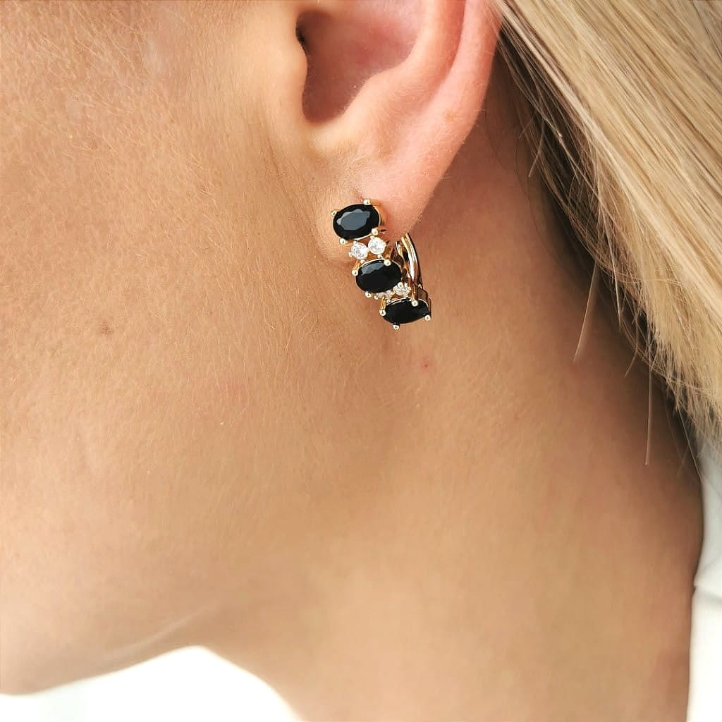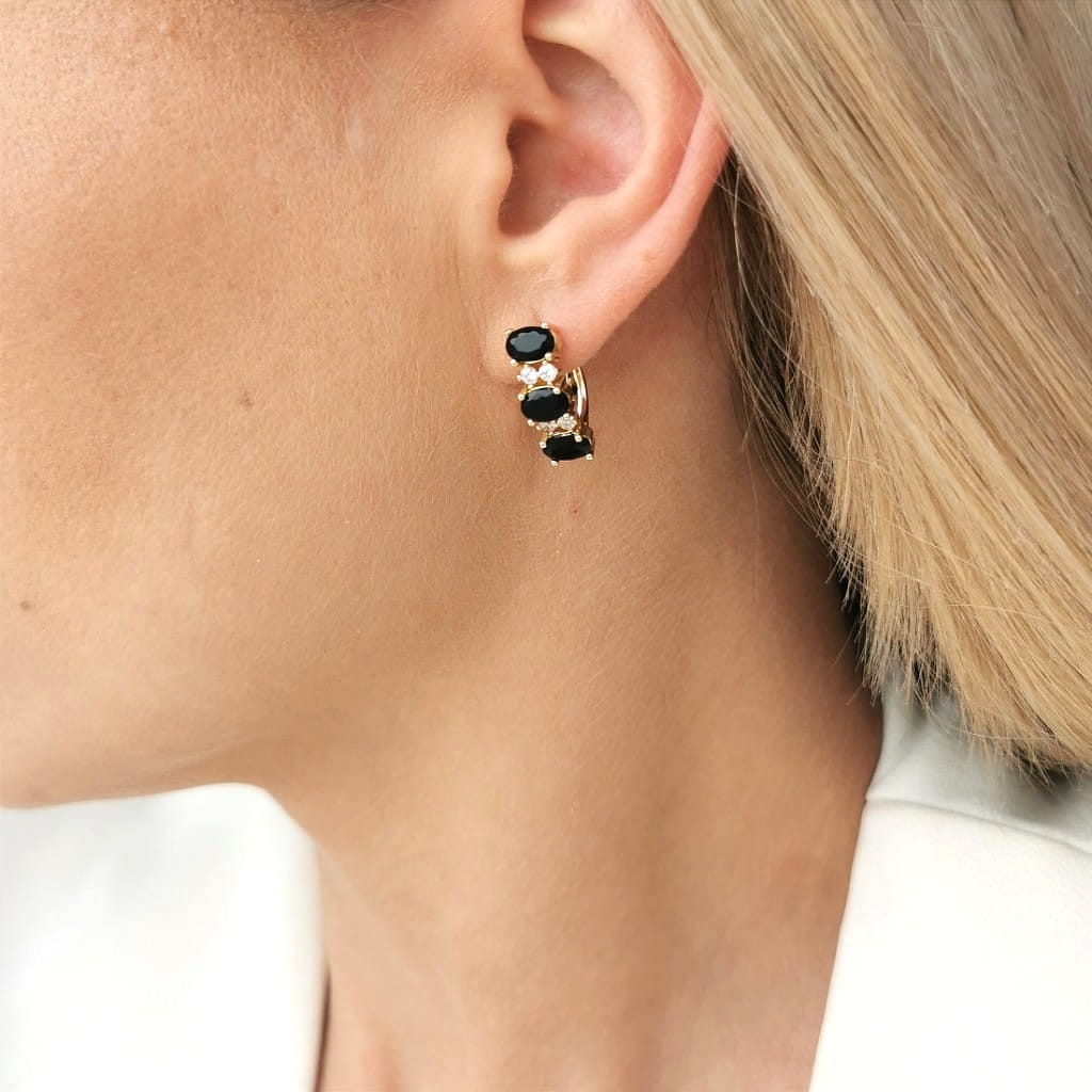 Klasyczne kolczyki z czarnymi kryształami i mniejszymi jasnymi cyrkoniami. Klasyczne kolczyki to propozycja, która sprawdzi się do każdej stylizacji i doda jej uroku.