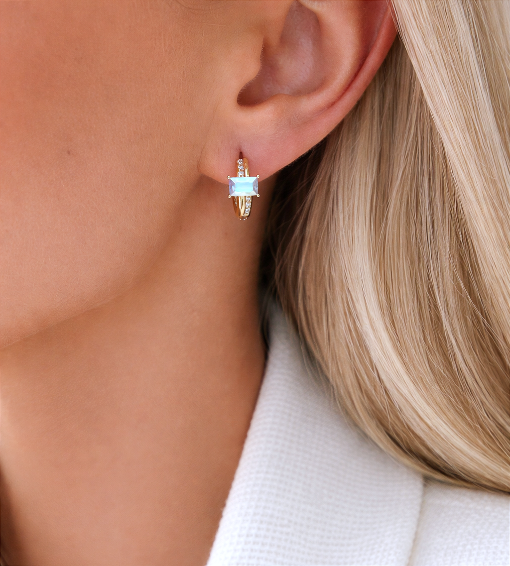 Klasyczne kolczyki koła z opalizującym kryształem i mniejszymi cyrkoniami. Wzór pozlacany 14 karatowym złotem to propozycja idealna jako uzupełnienie codziennej stylizacji. Wygodne zapięcie, lekka forma.