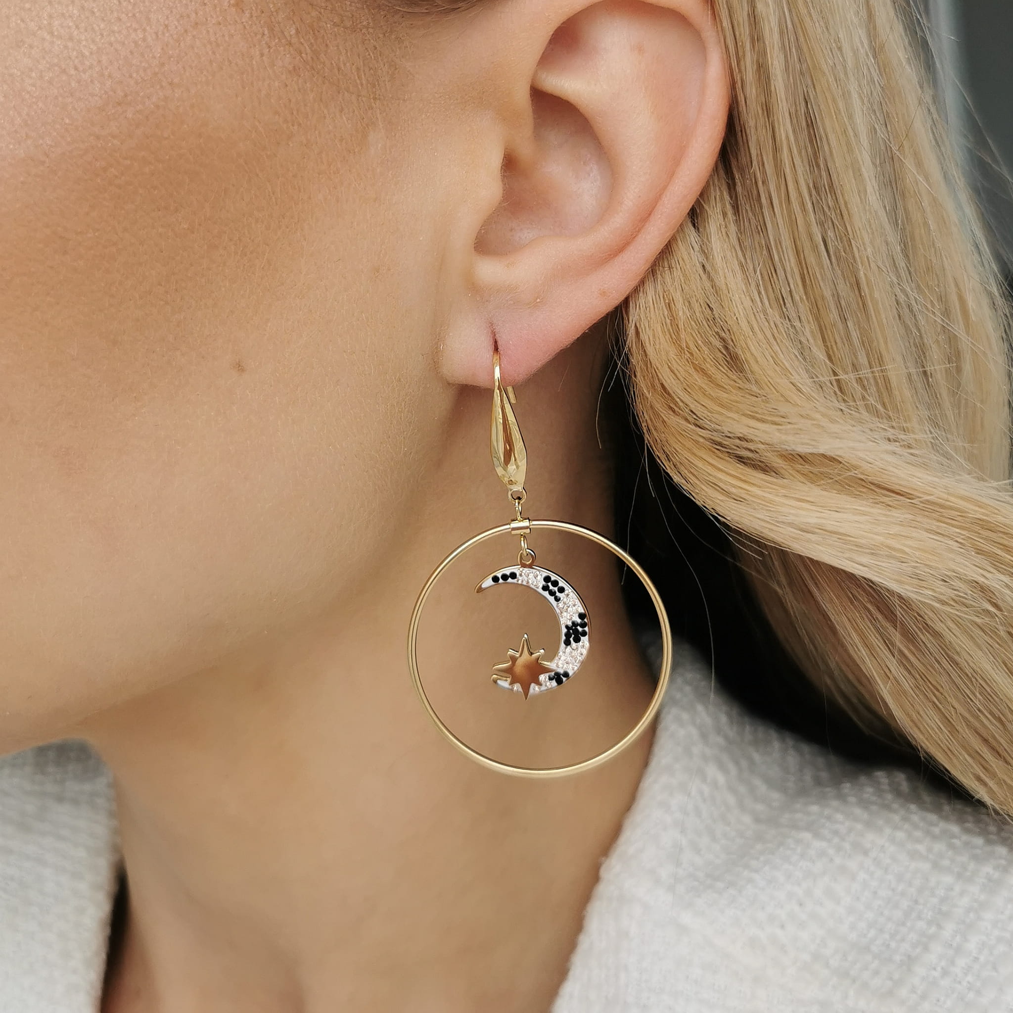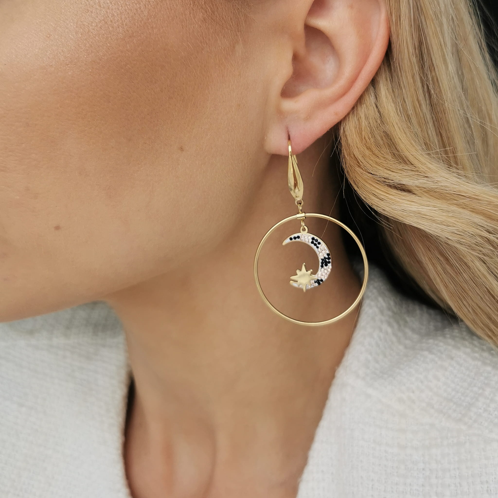 Niebanalne kolczyki koła z motywem cyrkoniowego księżyca i gwiazdki. Z pewnością przyciągają uwagę, dzięki swojej oryginalności. Idealnie sprawdzą się jako dodatek do stylizacji dziennej, jak i wieczorowej. Idealne także na prezent.