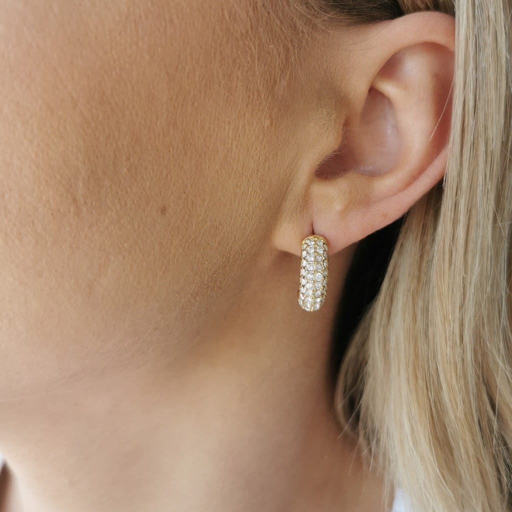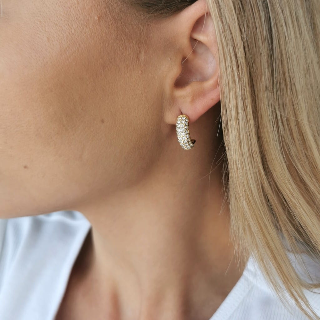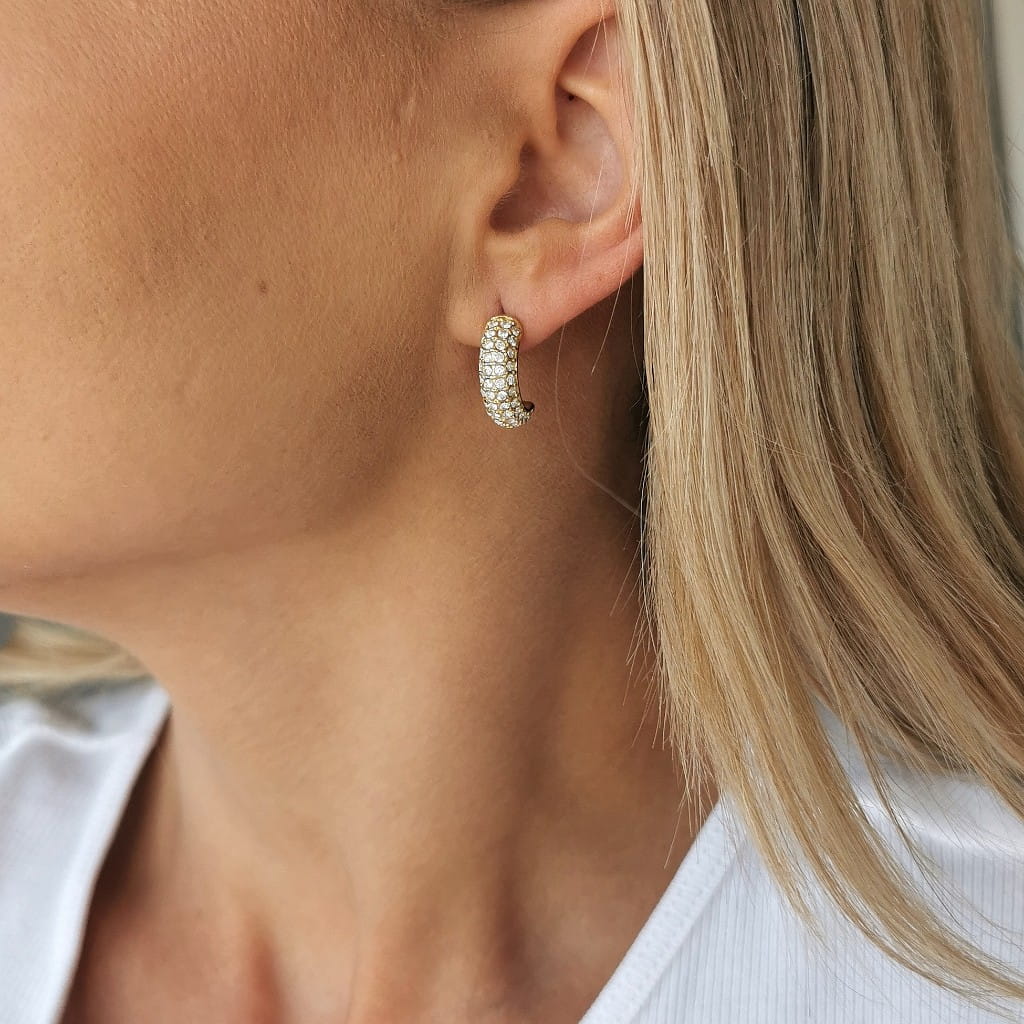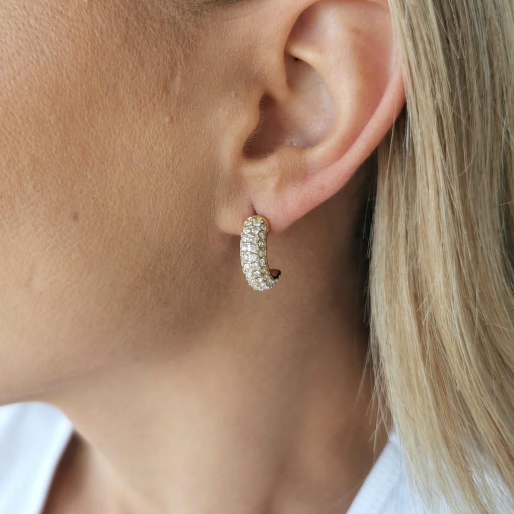 Efektowne i modne koczyki koła, bogato zdobione jasnymi cyrkoniami. Pięknie odbijają światło i przyciągają uwagę. MUST have każdej kobiety kochającej modę i styl!