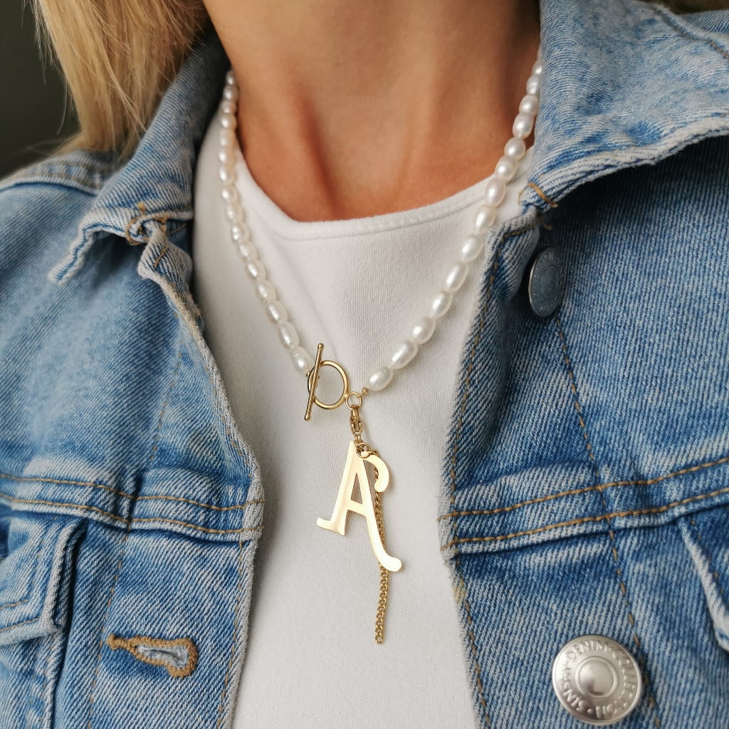 Prześliczny naszyjnik z najnowszej kolekcji SOHO Biżuteria, wykonany z wysokiej jakości stali chirurgicznej 316l oraz pereł naturalnych. Naszyjnik ze stali pozłacanej ozdobiony został złotą zawieszką z literą A. Zawieszkę można odpinać. Dodatkowego uroku dodaje mu zapięcie typu toggle. Prezentuje się niezwykle okazale. Idealnie wpasuje się do stylizacji dziennych, jak i wieczorowych, a także sukienek, swetrów czy jeansów. Must have u każdej kobiety kochającej modę i styl. Musisz go mieć!