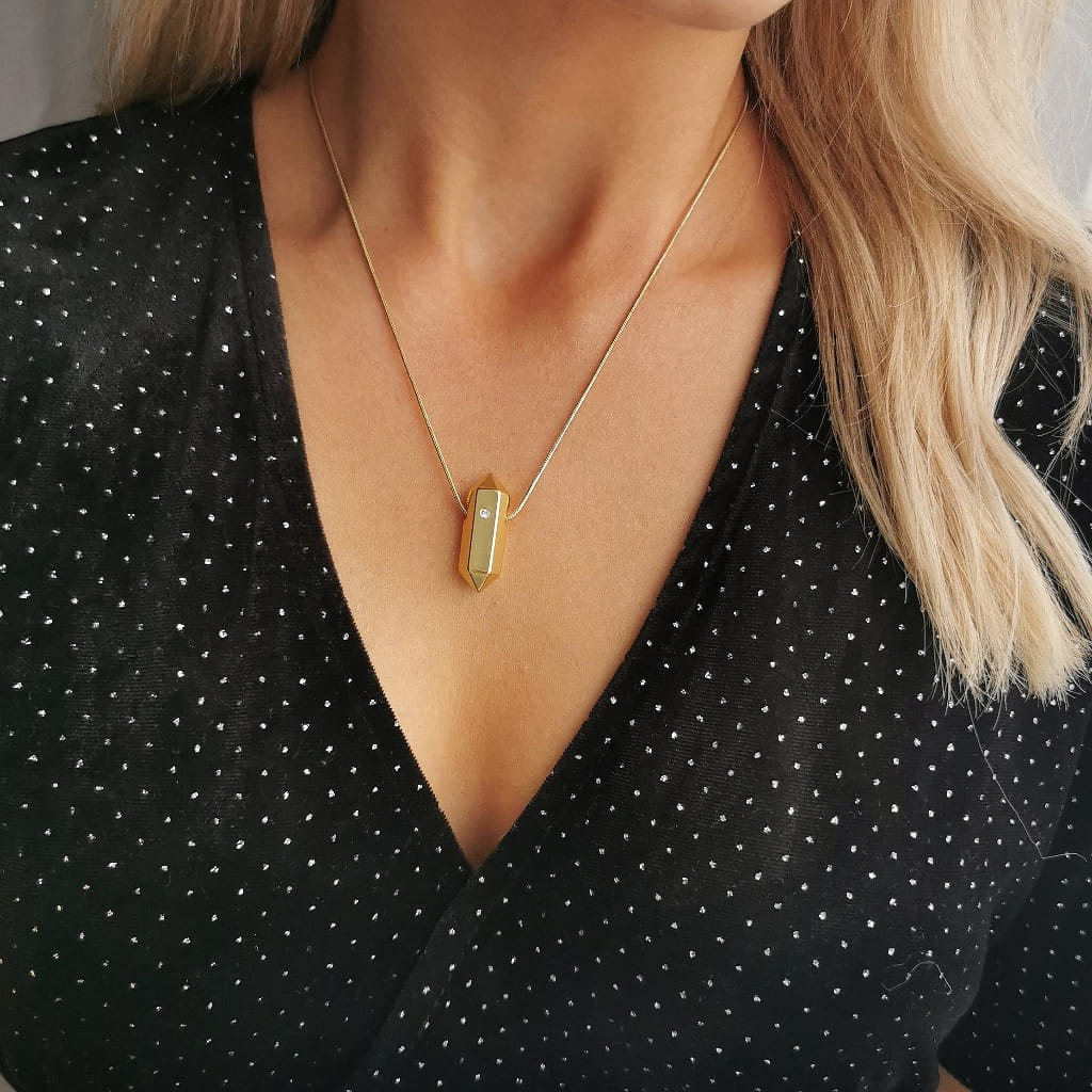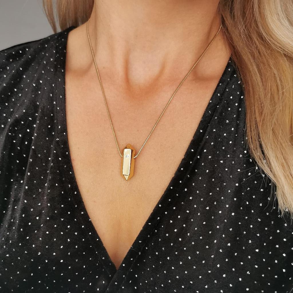 Efektowny naszyjnik z kolekcji Premium Colibra w formie kryształu górskiego - biżuteria wykonywana ręcznie w Polsce, w całości w kraju. Produkty tworzone są wyłącznie z przyjaznych dla skóry, antyalergicznych stopów metali, niezawierających niklu, pokrytych wysokiej klasy materiałami – 24 karatowym złotem, srebrem oraz rutenem. Do produkcji wykorzystuje się wyłącznie znane w całej Europie kryształy Crystallized–Swarovski.