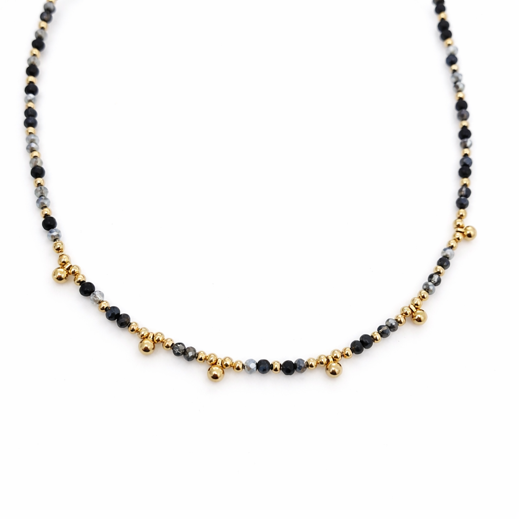 Naszyjnik choker czarne szare koraliki kuleczki złote STAL POZŁACANA