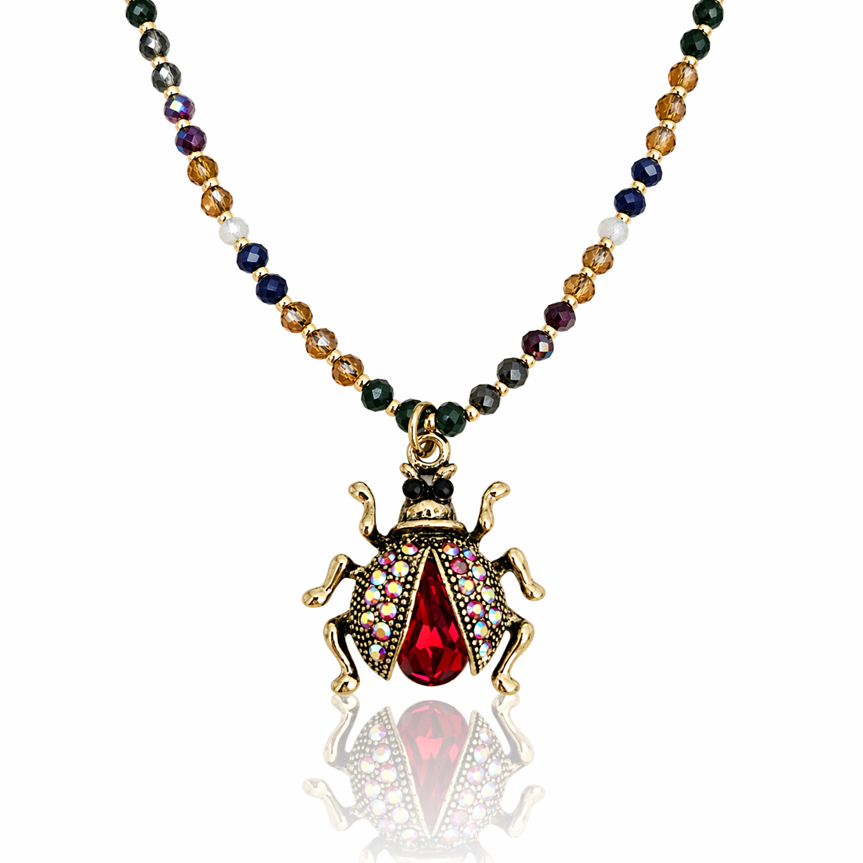 Unikatowy naszyjnik z bogato zdobioną zawieszką - żukiem. Łańcuszek bogato zdobipny fasetowanymi kryształami w kolorach beżu, zieleni, szafiru. Pięknie prezentuje się zarówno do białej koszuli, letniej zwiewnej bluzki czy marynarki.