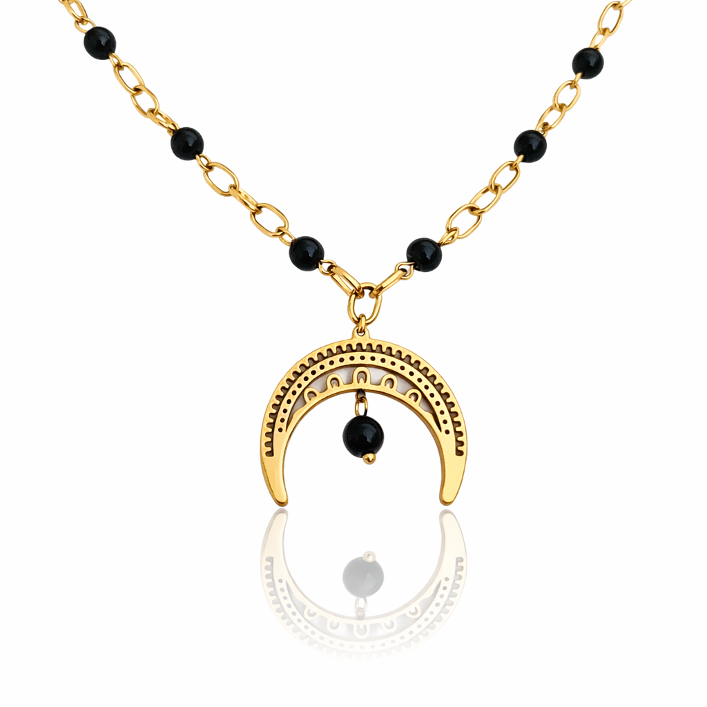 Naszyjnik lunula księżyc czarne koraliki ze STALI CHIRURGICZNEJ złoty