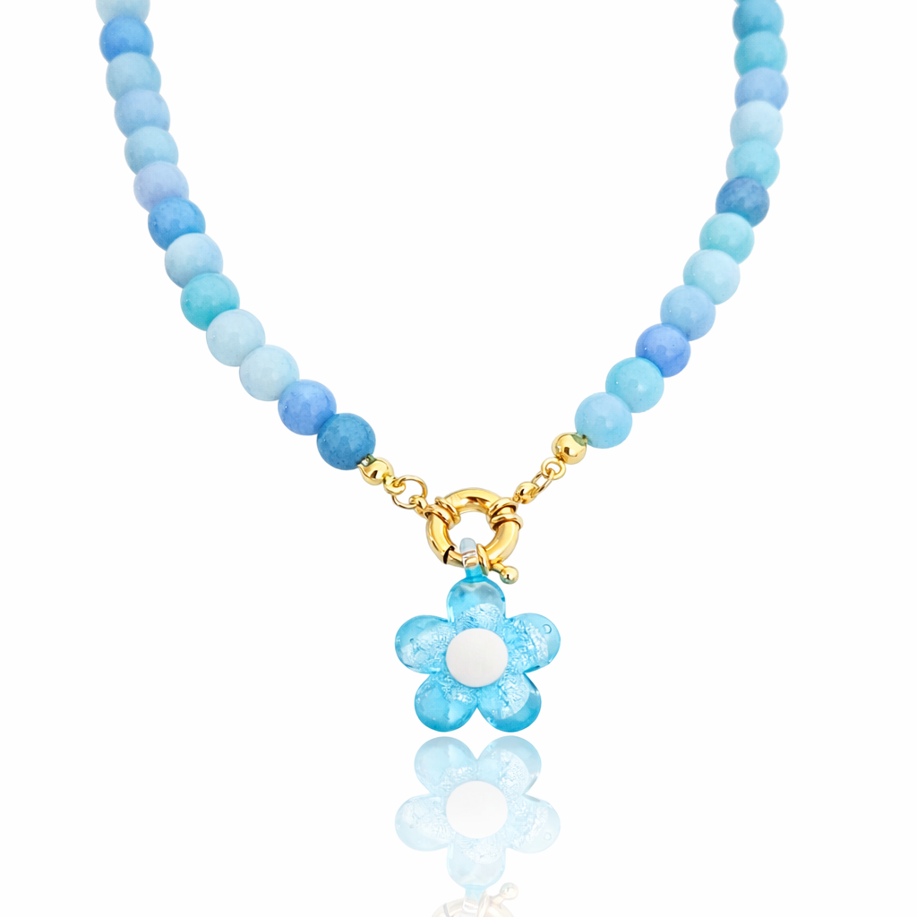 Motyw kwiatów w połączeniu z kamieniami naturalnymi to świetnie polączenie do wielu stylizacji. Ten uroczy naszyjnik będzie świetnym dodatkiem do wiosennych i letnich stylizacji. Sprawdzi się zarówno do koszuli, topu czy sukienki. Niebieskie kamienie w połączeniu z uroczą zawieszką nadają mu wdzięczności i lekkości. Zawieszkę można zdjąć lub założyć swoją ulubioną zawieszkę.