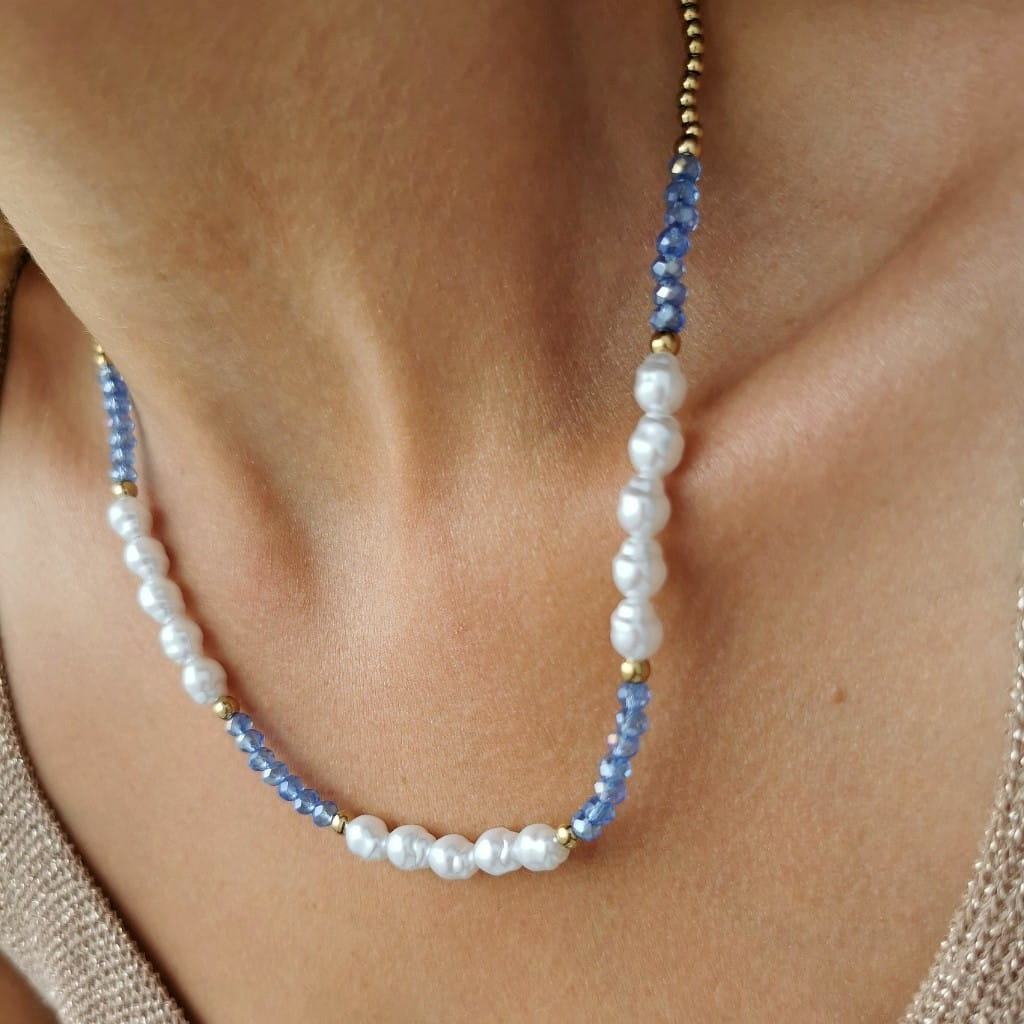 Stylowy naszyjnik z najnowszej kolekcji, wykonany z wysokiej jakości stali chirurgicznej 316l, w kolorze złota. Naszyjnik stal szlachetna z delikatnymi perłami i niebieskimi fasetowanymi kryształkami. Pięknie prezentuje się na żywo i przyciąga uwagę. Modny motyw sprawia, że każda stylizacja będzie stylowa i z klasą.