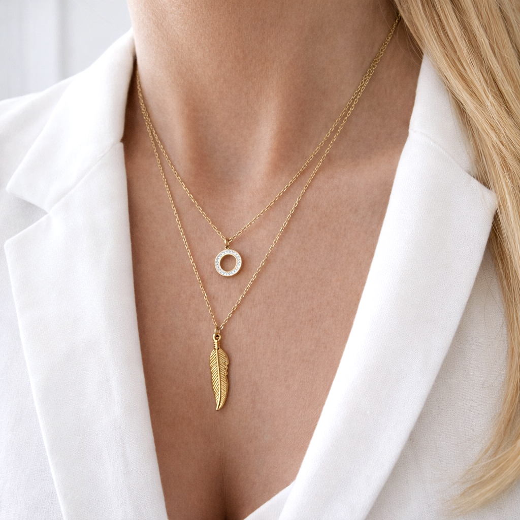 Podwójny łączony naszyjnik z piórkiem i kryształowym kółkiem. Naszyjnik pozłacany 14 karatowym zlotem to propozycja na co dzień, do każdej stylizacji.