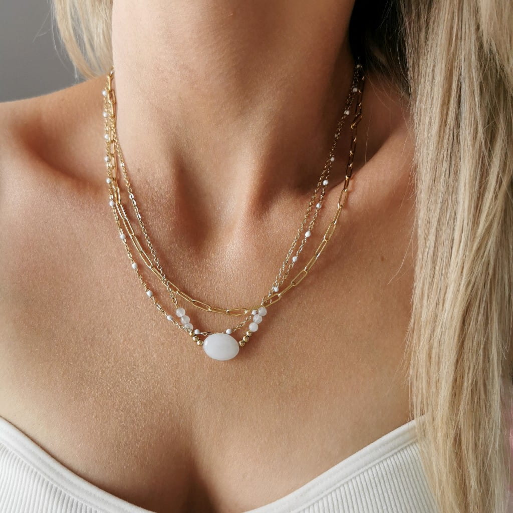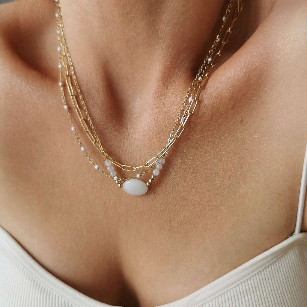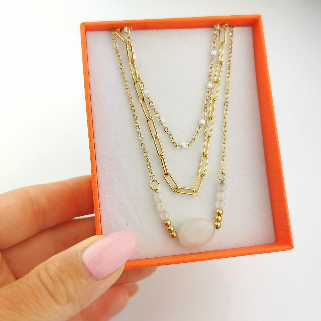 Naszyjnik potrójny ze STALI CHIRURGICZNEJ kamień białe koraliki kolor złoty