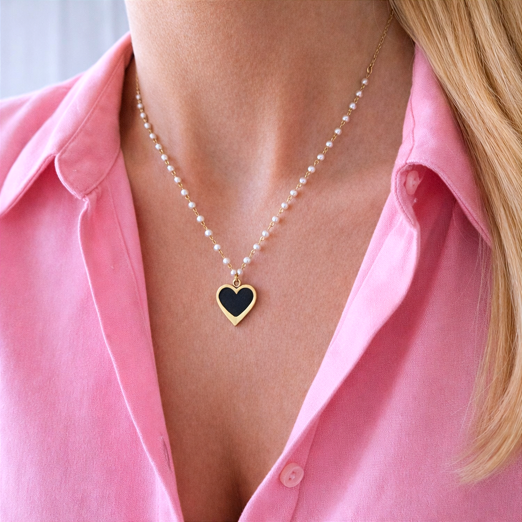 Naszyjnik z czarno-złotym sercem z niewielkimi perełkami. Model, który uzupełni zarówno koszulę, bawełniany tshirt czy koronkowy top.