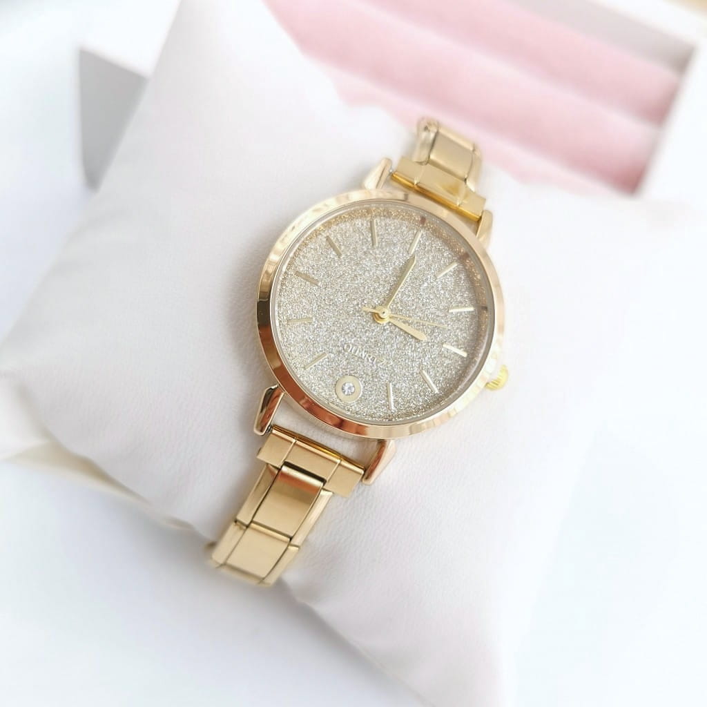 Elegancki damski zegarek bransolecie modułowej, wykonany ze stali nierdzewnej w kolorze złota. Tarcza w kolorze złota, ze złotymi wskazówkami. Zegarek posiada mechanizm kwarcowy - baterię można wymieniać u zegarmistrza.