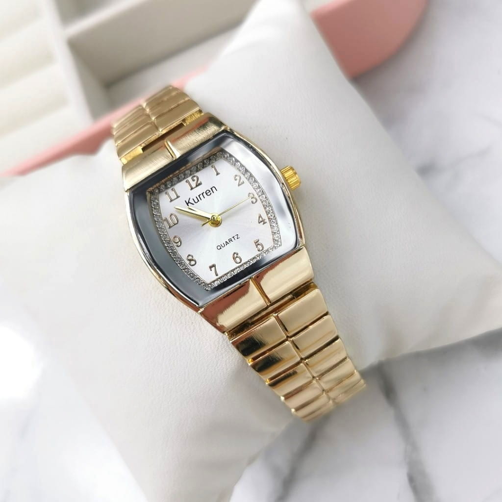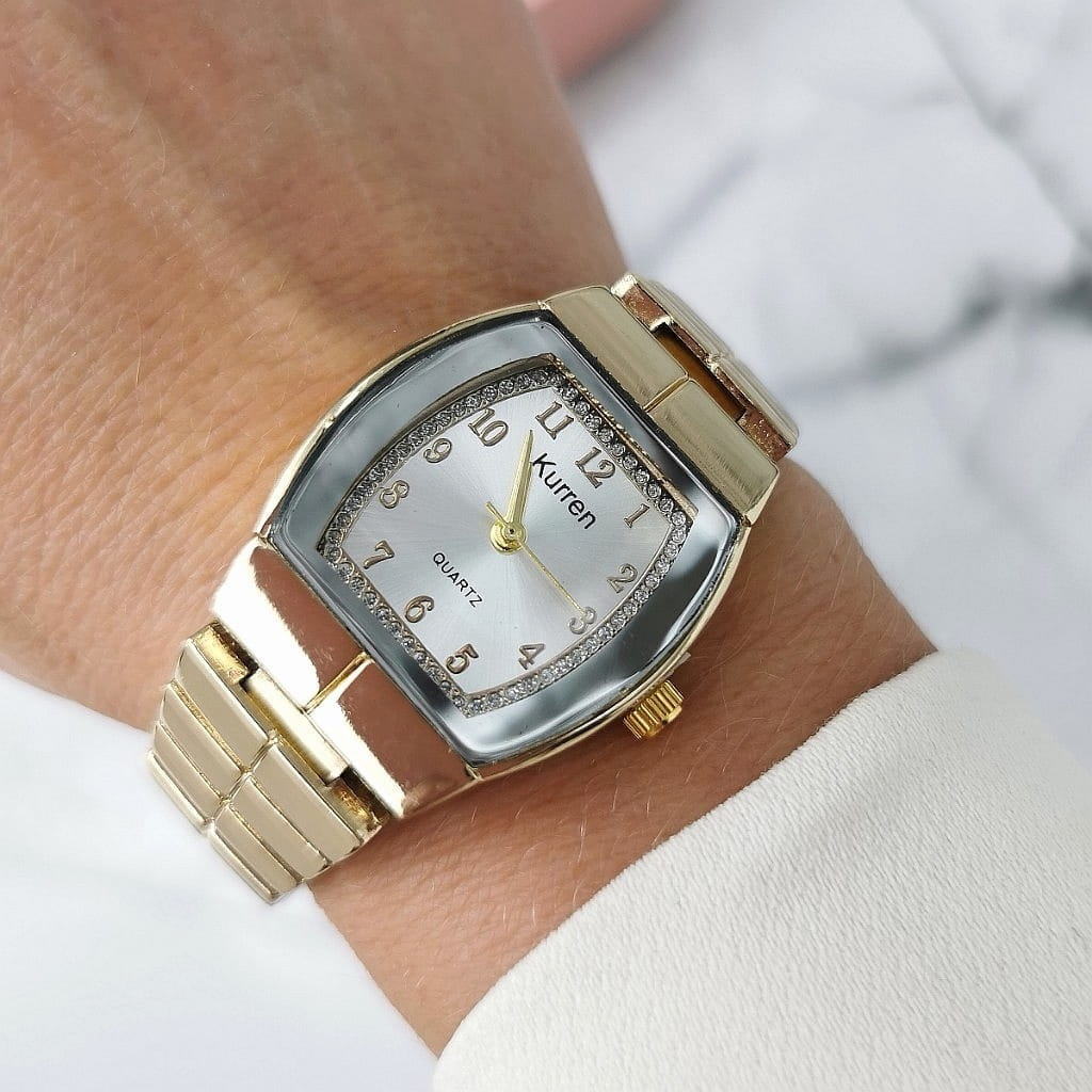 Elegancki damski zegarek marki Kurren na regulowanej bransolecie, wykonany ze stali nierdzewnej w kolorze złota. Tarcza w kolorze perłowym, ze złotymi wskazówkami. Zegarek posiada mechanizm kwarcowy - baterię można wymieniać u zegarmistrza. Bransoletę można skrócić samodzielnie lub u zegarmistrza.