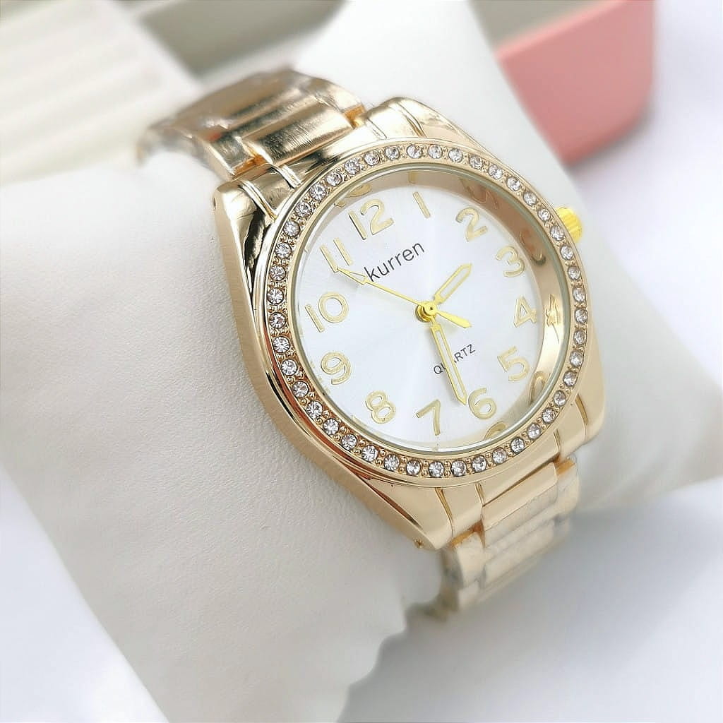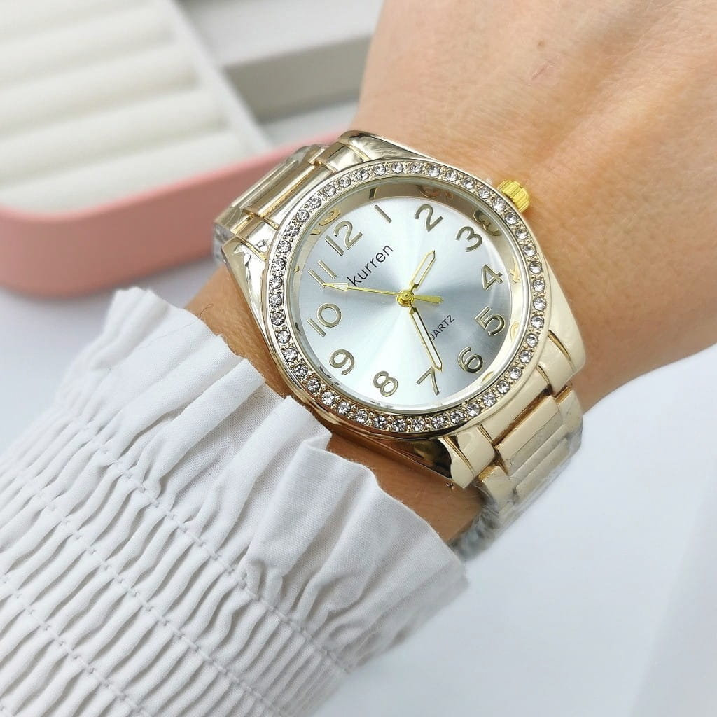 Elegancki damski zegarek marki Kurren na regulowanej bransolecie, wykonany ze stali nierdzewnej w kolorze złota. Tarcza w kolorze perłowym, ze złotymi wskazówkami. Zegarek posiada mechanizm kwarcowy - baterię można wymieniać u zegarmistrza. Bransoletę można skrócić samodzielnie lub u zegarmistrza.