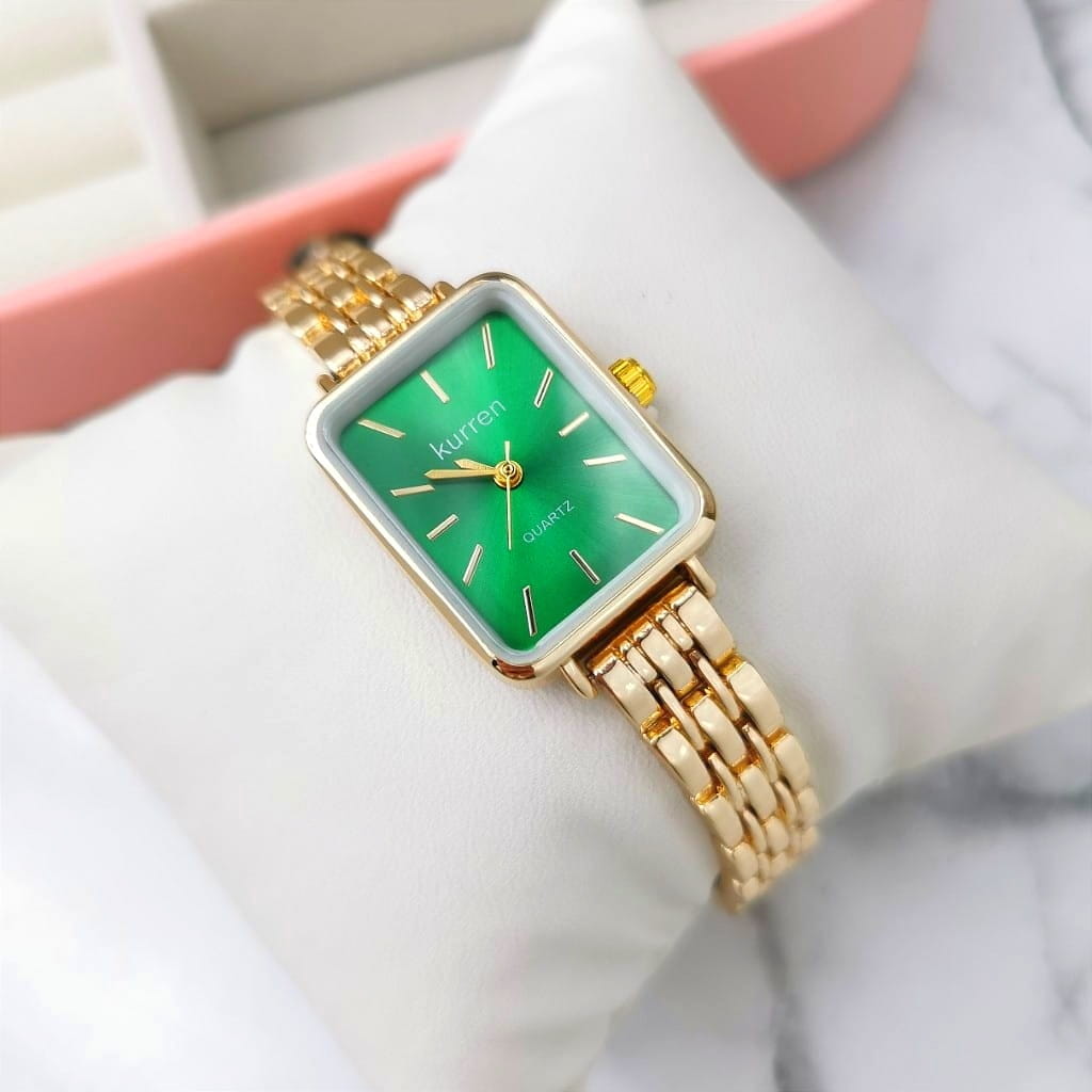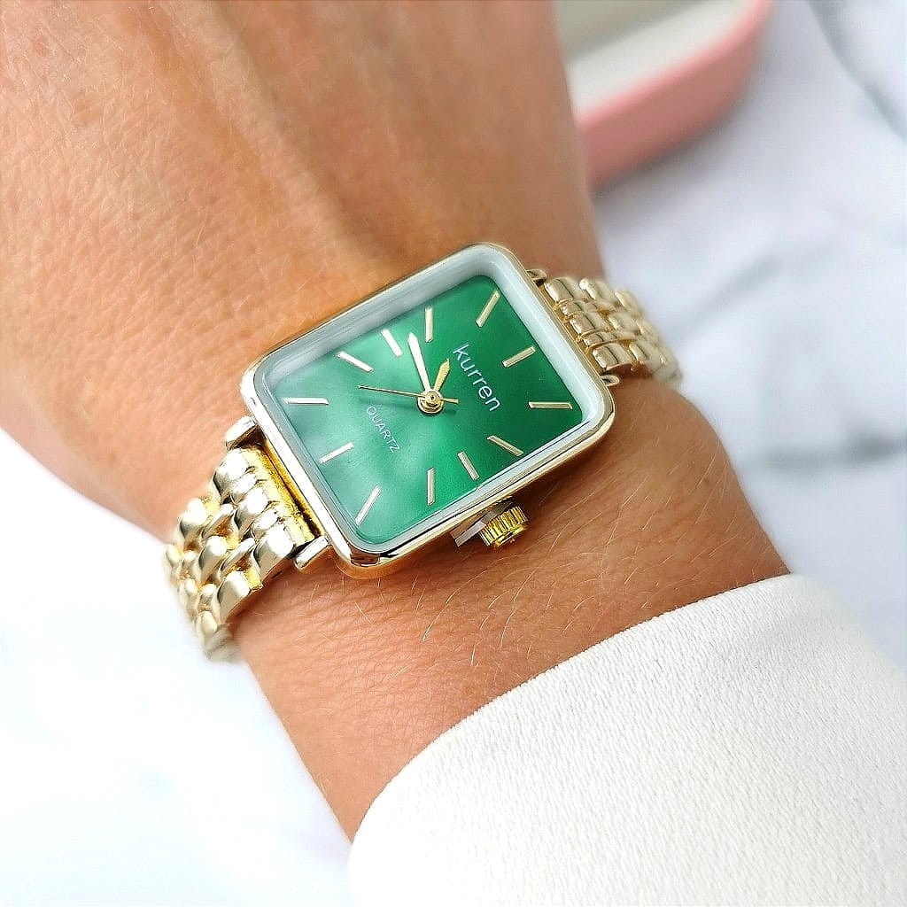 Elegancki damski zegarek marki Kurren na regulowanej bransolecie, wykonany ze stali nierdzewnej w kolorze złota. Tarcza w kolorze zielonym, ze złotymi wskazówkami. Zegarek posiada mechanizm kwarcowy - baterię można wymieniać u zegarmistrza. Bransoletę można skrócić samodzielnie lub u zegarmistrza.