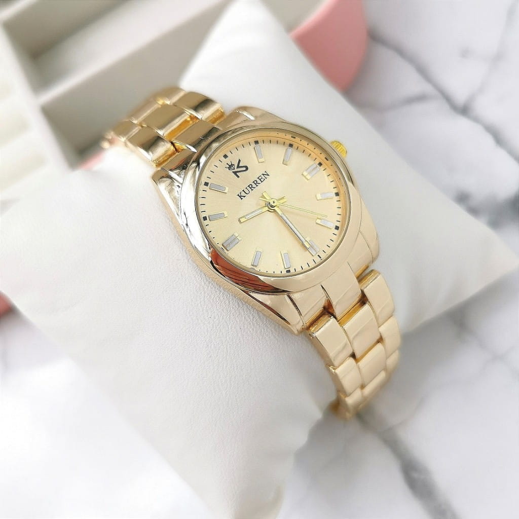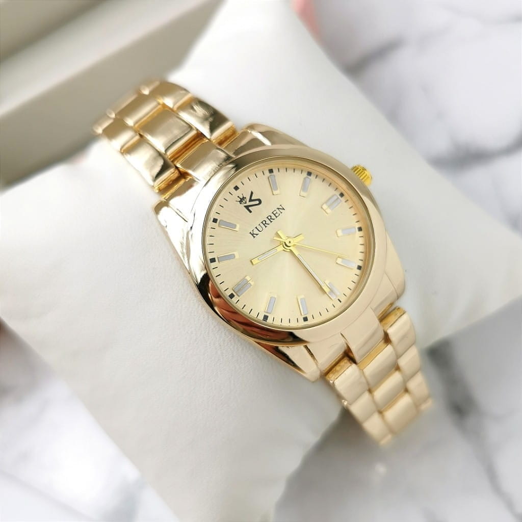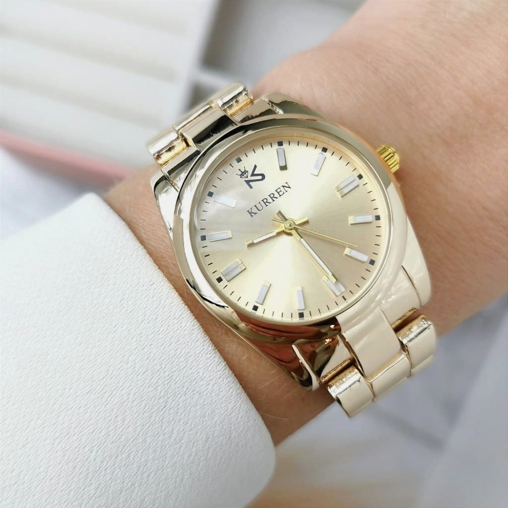 Elegancki damski zegarek marki Kurren na regulowanej bransolecie, wykonany ze stali nierdzewnej w kolorze złota. Tarcza w kolorze perłowym, ze złotymi wskazówkami. Zegarek posiada mechanizm kwarcowy - baterię można wymieniać u zegarmistrza. Bransoletę można skrócić samodzielnie lub u zegarmistrza.