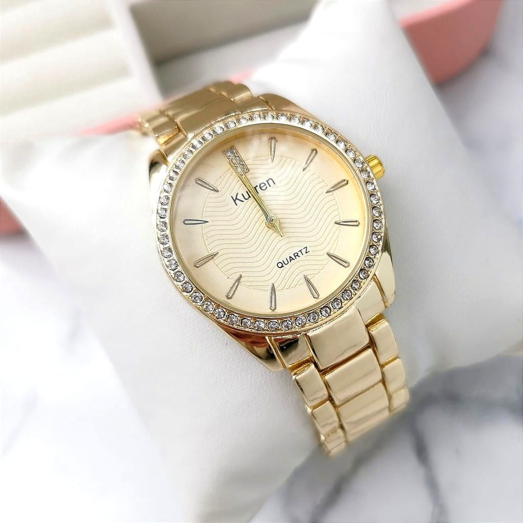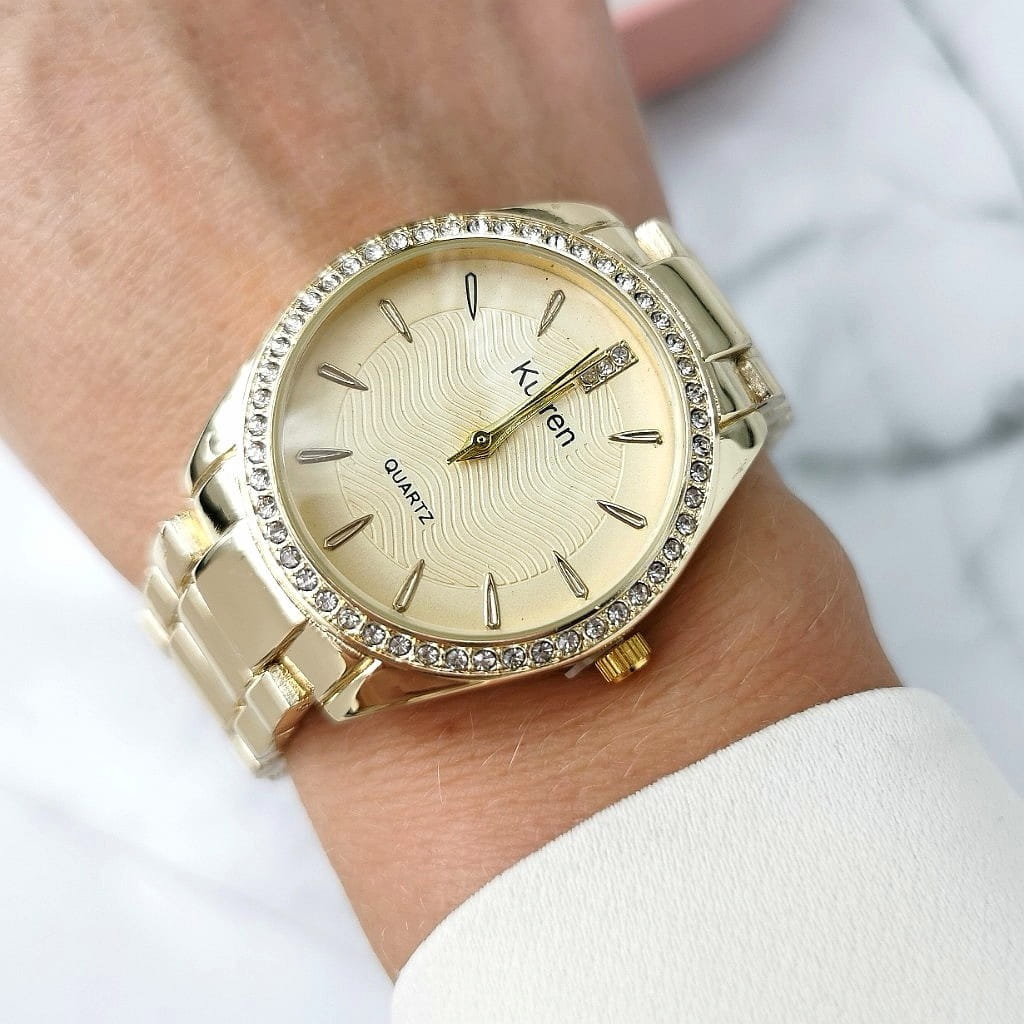 Elegancki damski zegarek marki Kurren na regulowanej bransolecie, wykonany ze stali nierdzewnej w kolorze złota. Tarcza w kolorze złotym, ze złotymi wskazówkami. Zegarek posiada mechanizm kwarcowy - baterię można wymieniać u zegarmistrza. Bransoletę można skrócić samodzielnie lub u zegarmistrza.