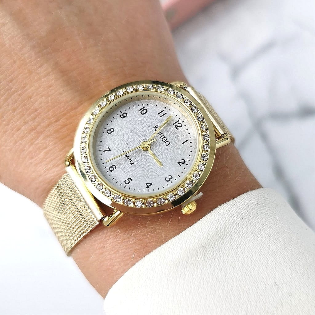 Zegarek damski ekskluzywny ZŁOTY na pasku mesh szara metaliczna tarcza kryształy