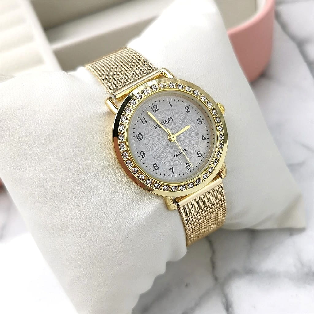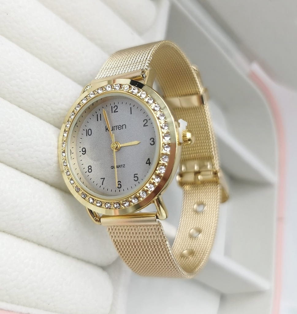 Elegancki damski zegarek marki Kurren na pasku, wykonany ze stali nierdzewnej w kolorze złotym. Tarcza w kolorze szaro-metalicznym, ze złotymi wskazówkami. Stylowy dodatek dla modnej kobiety. W zestawie z bransoletką stworzy świetny look. Zegarek posiada mechanizm kwarcowy - baterię można wymieniać u zegarmistrza.