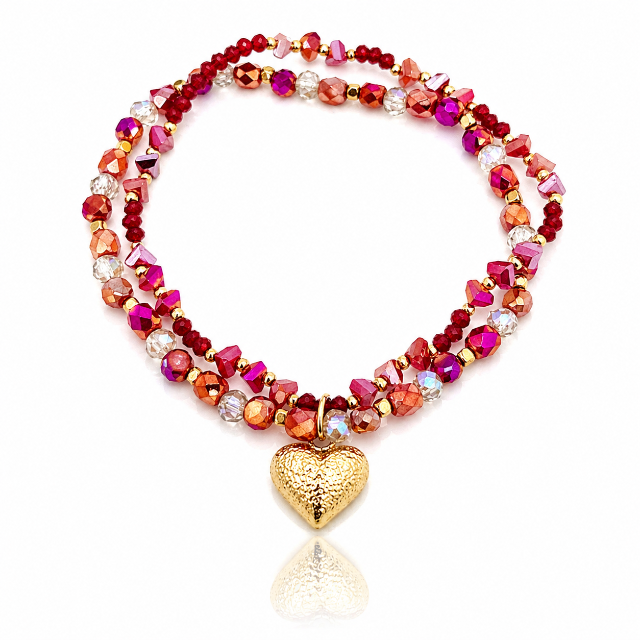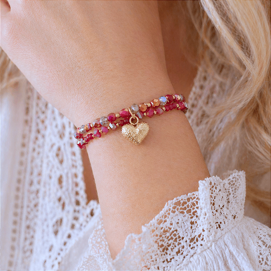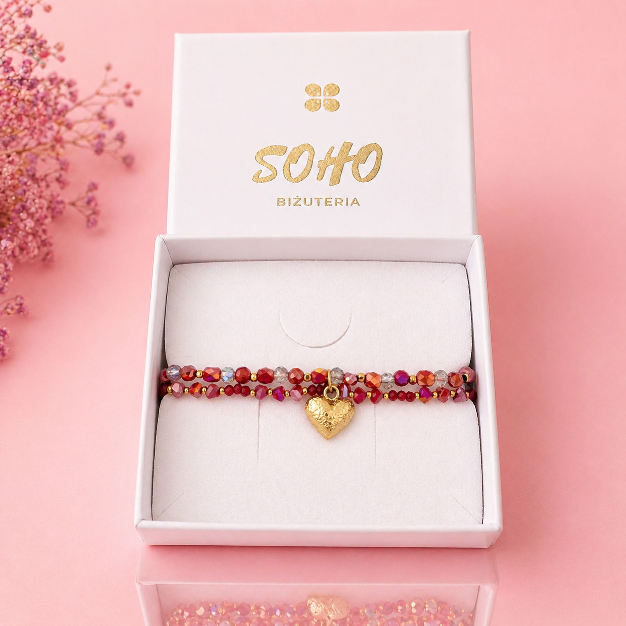 Zestaw bransoletek serce kryształy bordowe koraliki POZŁACANA STAL PREMIUM