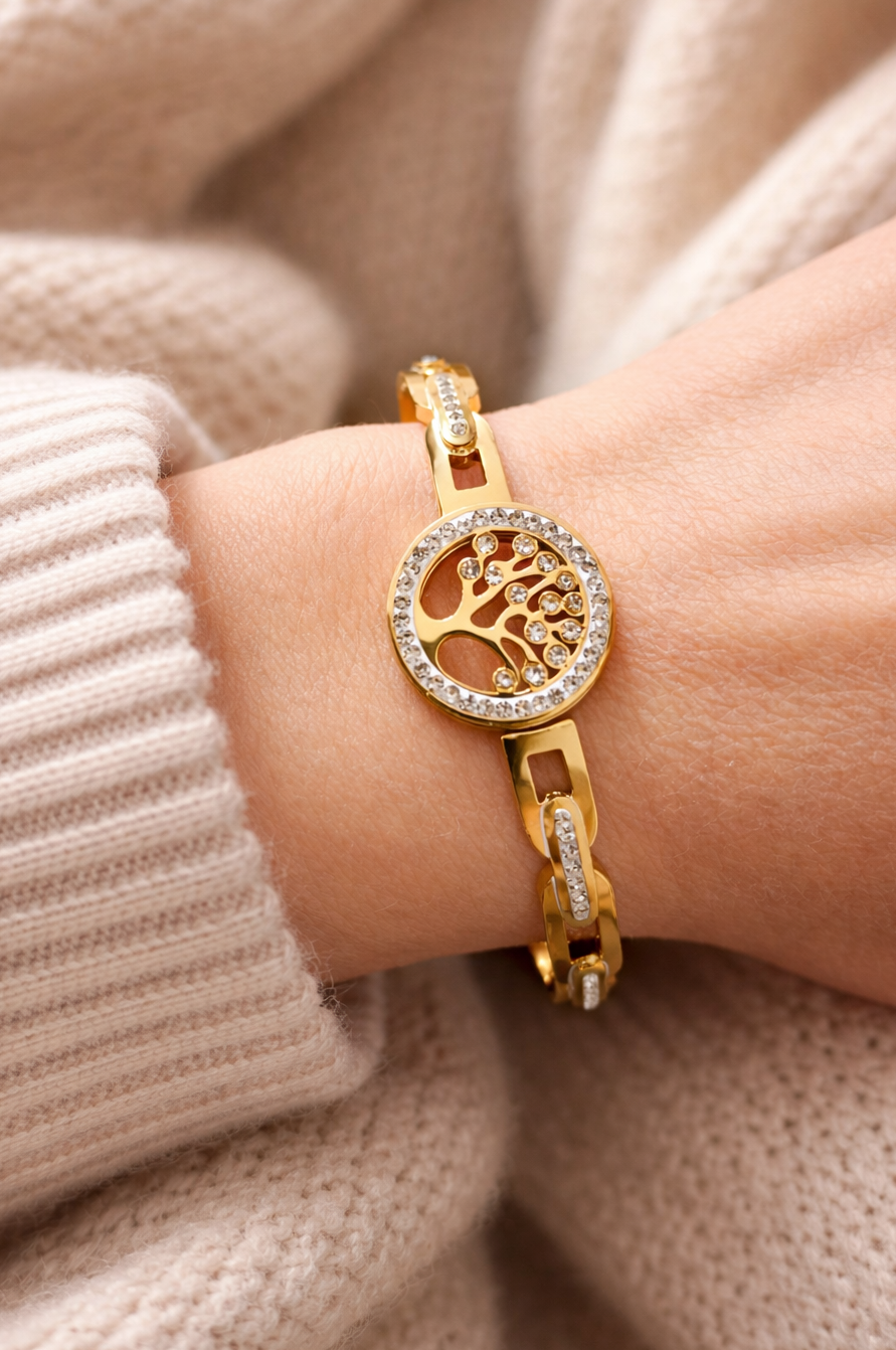 Bransoletka platerowana 14 karatowym złotem z motywem drzewka szczęścia i jasnych cyrkonii. Pięknie odbija światło i dopełni każdą stylizację.