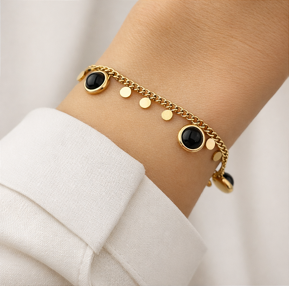 Stylowa bransoletka z najnowszej kolekcji, wykonana z wysokiej jakości stali chirurgicznej 316l, w kolorze złota. Bransoletka stal szlachetna z czarnymi okrągłymi kryształkami. Pięknie prezentuje się na żywo i przyciąga uwagę. Każda stylizacja będzie stylowa i z klasą.