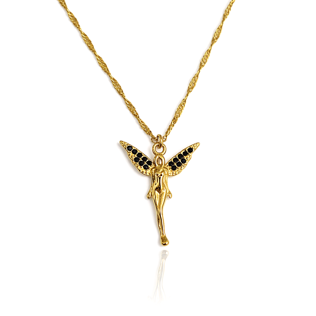 Złoty naszyjnik ze STALI CHIRURGICZNEJ anioł czarne kryształy